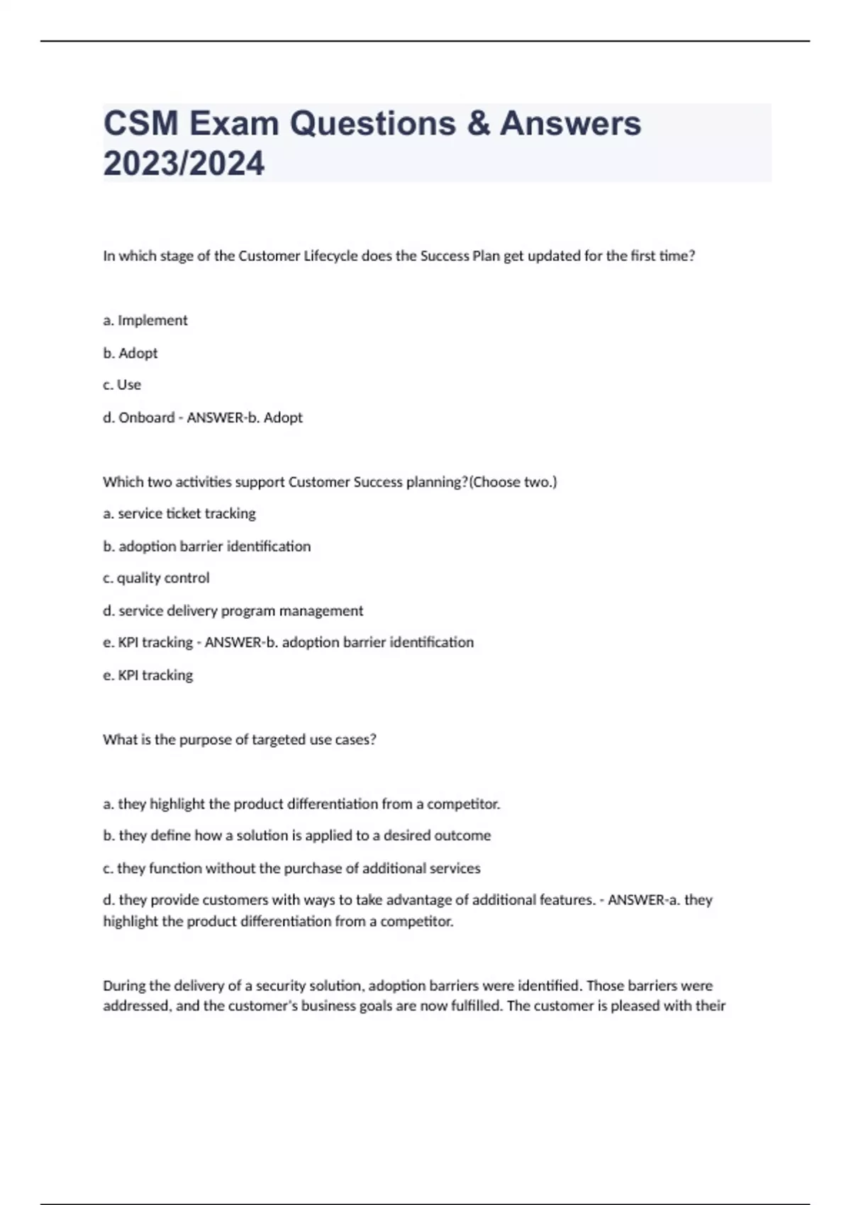 CSM Exam Questions & Answers 2023/2024 In which stage of the Customer Lifecycle does the Success Plan get updated for the first time? a. Implement b. Adopt c. Use d. Onboard - ANSWER-b. Adopt Which two activities support Customer Success planning?(Choose two.) a. service ticket tracking b. adoption barrier identification c. quality control d. service delivery program management e. KPI tracking - ANSWER-b. adoption barrier identification e. KPI tracking What is the purpose of targeted use cases? a. they highlight the product differentiation from a competitor. b. they define how a solution is applied to a desired outcome c. they function without the purchase of additional services d. they provide customers with ways to take advantage of additional features. - ANSWER-a. they highlight the product differentiation from a competitor. During the delivery of a security solution, adoption barriers were identified. Those barriers were addressed, and the customer's business goals are now fulfilled. The customer is pleased with their