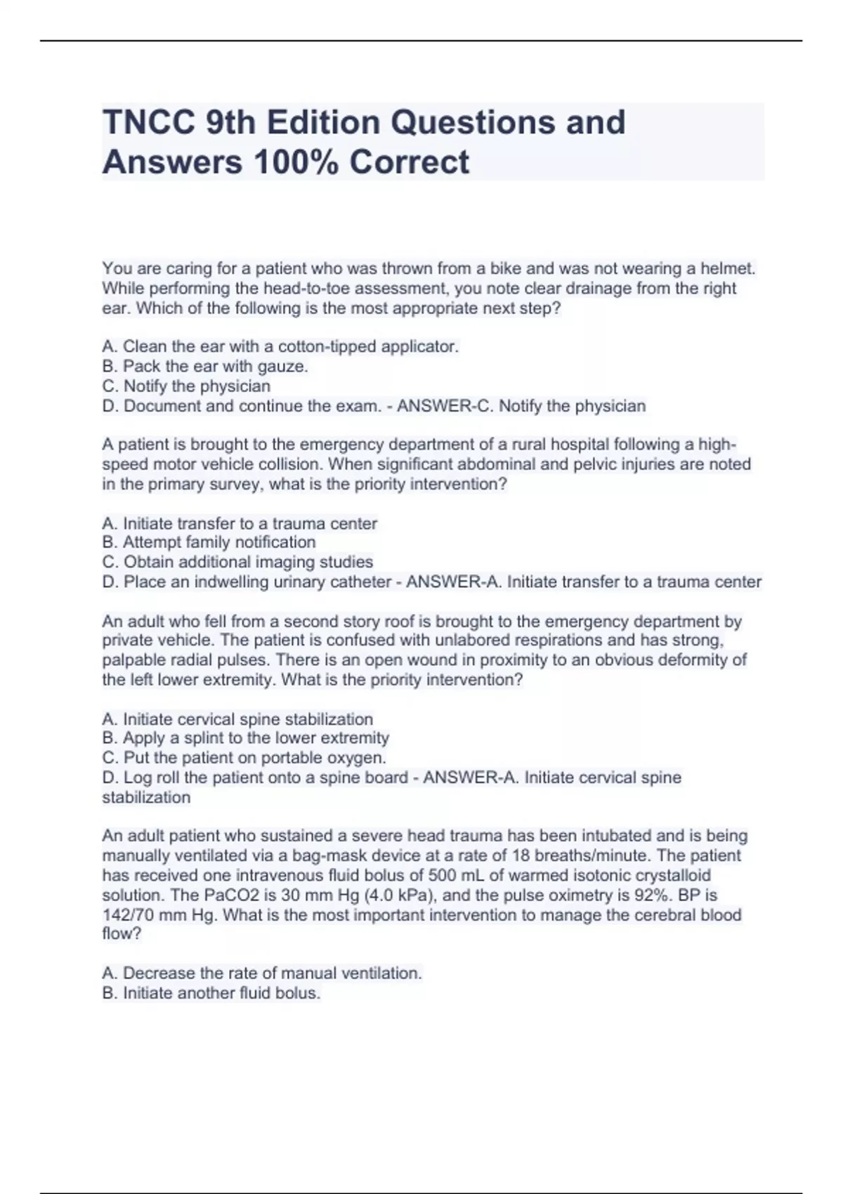 TNCC 9th Edition Questions and Answers 100% Correct TNCC 9th Edition Questions and Answers 100% Correct TNCC 9th Edition Questions and Answers 100% Correct TNCC 9th Edition Questions and Answers 100% Correct You are caring for a patient who was thrown from a bike and was not wearing a helmet. While performing the head-to-toe assessment, you note clear drainage from the right ear. Which of the following is the most appropriate next step? A. Clean the ear with a cotton-tipped applicator. B. Pack the ear with gauze. C. Notify the physician D. Document and continue the exam. - ANSWER-C. Notify the physician A patient is brought to the emergency department of a rural hospital following a high-speed motor vehicle collision. When significant abdominal and pelvic injuries are noted in the primary survey, what is the priority intervention? A. Initiate transfer to a trauma center