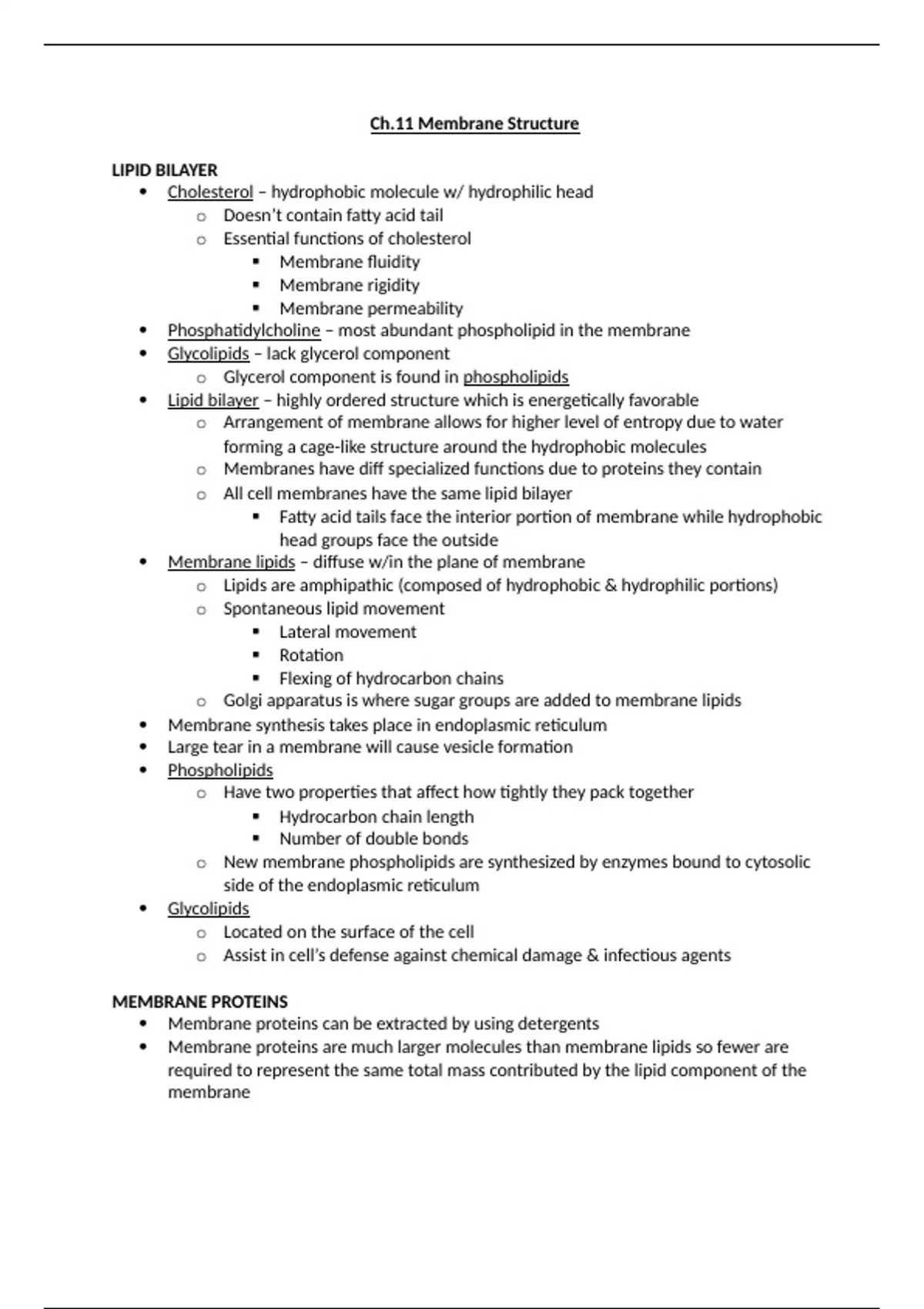 The document "PathoPhys Ch.11 Membrane Structure" provides an in-depth analysis of cellular membrane composition and function. It details the lipid bilayer structure, types of lipids involved, and their roles in membrane fluidity and permeability. It also examines membrane proteins, including their types and functions within the membrane context. The text further explores the biophysical properties of cell membranes, the importance of cholesterol and glycolipids, and mechanisms of membrane synthesis and repair. Techniques for studying membrane flow such as FRAP and SPT are also discussed, showcasing the dynamic nature of cellular membranes. This chapter is fundamental for understanding cellular processes related to membrane structure.