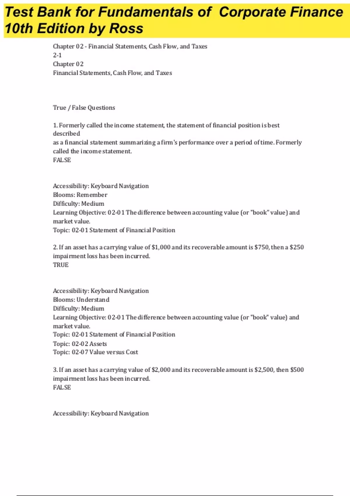 Complete Test Bank Fundamentals of Corporate Finance 10th Edition Ross Questions & Answers with rationales