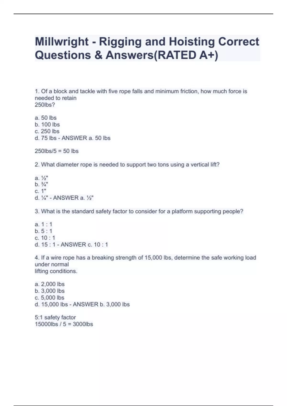1. Of a block and tackle with five rope falls and minimum friction, how much force is needed to retain 250lbs? a. 50 lbs b. 100 lbs c. 250 lbs d. 75 lbs - ANSWER a. 50 lbs 250lbs/5 = 50 lbs 2. What diameter rope is needed to support two tons using a vertical lift? a. ½" b. ¾" c. 1" d. ¼" - ANSWER a. ½" 3. What is the standard safety factor to consider for a platform supporting people? a. 1 : 1 b. 5 : 1 c. 10 : 1 d. 15 : 1 - ANSWER c. 10 : 1 4. If a wire rope has a breaking strength of 15,000 lbs, determine the safe working load under normal lifting conditions. a. 2,000 lbs b. 3,000 lbs c. 5,000 lbs d. 15,000 lbs - ANSWER b. 3,000 lbs 5:1 safety factor 15000lbs / 5 = 3000lbs 5. Given a rope strength of 12,650 lbs, and splicing the rope reduces strength by 25%, determine the new rope strength for normal rigging conditions. a. 1897.5 lbs b. 948.75 lbs c. 1000 lbs d. 2300 lbs - ANSWER a. 1897.5 lbs [12650 lbs/5(safety factor)] x 0.75 =1897.5 lbs 6. What type of lifting technique has the least lifting capacity (if all use the same rope)? a. Basket hitch b. 2 part Bridle c. Vertical hitch d. Choker sling - ANSWER d. Choker sling 7. What type of sling presentation will accept 200% of the SWL? a. Choker b. Basket c. Bridle d. Vertical - ANSWER b. Basket 8. The signal for stop in rigging is: a. Point finger b. Flat of hand waved across chest c. Wave hands in the air d. Finger pointed downward into palm of hand - ANSWER b. Flat of hand waved across chest 9. The construction of wire rope is determined by the direction of the twist of strands. This is known as: a. Lay b. Form c. Stranding d. Mesh - ANSWER a. Lay 10. A flexible wire rope for overhead crane use is: a. 6-19 b. 6-37 c. 8-19 d. 6-8 - ANSWER b. 6-37 11. A type of knot used to tie two lines of the same size together so they will not slip: a. Bowline b. Granny c. Reef