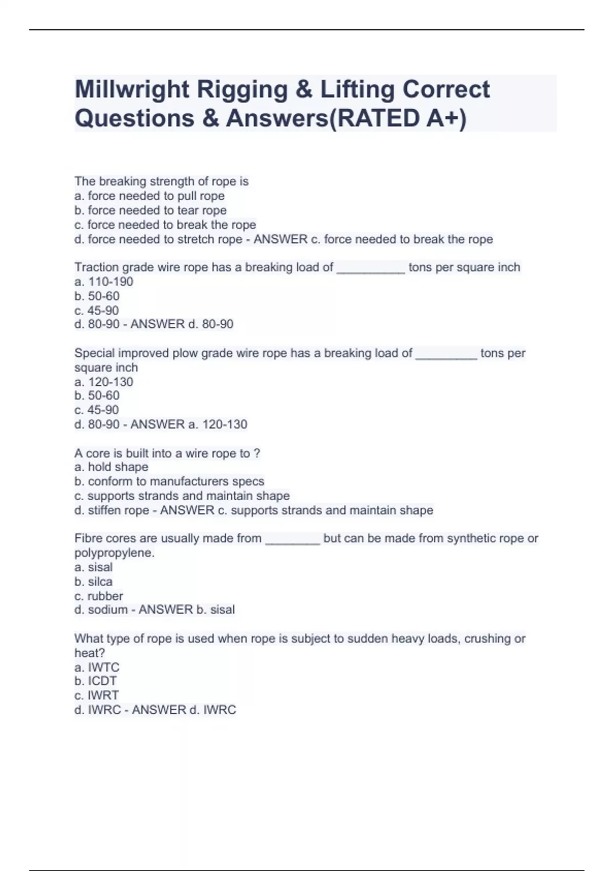 The breaking strength of rope is a. force needed to pull rope b. force needed to tear rope c. force needed to break the rope d. force needed to stretch rope - ANSWER c. force needed to break the rope Traction grade wire rope has a breaking load of __________ tons per square inch a. 110-190 b. 50-60 c. 45-90 d. 80-90 - ANSWER d. 80-90 Special improved plow grade wire rope has a breaking load of _________ tons per square inch a. 120-130 b. 50-60 c. 45-90 d. 80-90 - ANSWER a. 120-130 A core is built into a wire rope to ? a. hold shape b. conform to manufacturers specs c. supports strands and maintain shape d. stiffen rope - ANSWER c. supports strands and maintain shape Fibre cores are usually made from ________ but can be made from synthetic rope or polypropylene. a. sisal b. silca c. rubber d. sodium - ANSWER b. sisal What type of rope is used when rope is subject to sudden heavy loads, crushing or heat? a. IWTC b. ICDT c. IWRT d. IWRC - ANSWER d. IWRC Independent Wire Rope Cores or WRC wire rope cores Lay refers to the direction in which the rope are twisted together. The term lay length refers to the ___________ along the rope in which a strand makes one revalution a. size b. distance c. direction d. angle - ANSWER b. distance This consists of a number of wires twisted to the left around a small core to form each of six strands. These strands are then twisted to the right around the main core to form the final rope a. Lang lay b. Left lay c. Center lay d. Right lay - ANSWER d. Right lay This consists of wires twisted to the right and then the strands twisted to the left to produce the rope a. Lang lay b. Left lay c. Center lay d. Right lay - ANSWER b. left lay This consists of wires or strands twisted in the same direction. a. Lang lay b. Left lay c. Center lay d. Lang lay - ANSWER d. lang lay -Disadvantages include both ends need fastened to prevent unraveling -must not be used in single part lift or with swivels -cannot be used with slings and does not resist cutting Is more flexible has more area in contact with drum spools Wire ropes are classified by 4 factors number of ropes number of str