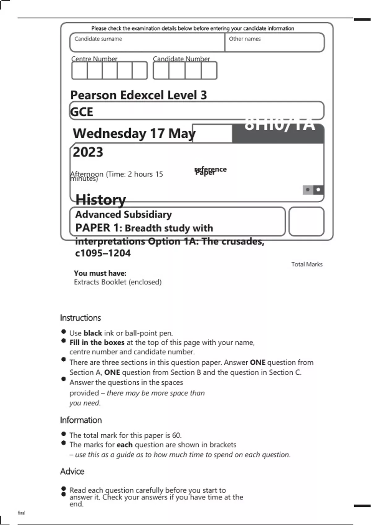 Edexcel AS History 8HI0/1A Question Paper May2023.