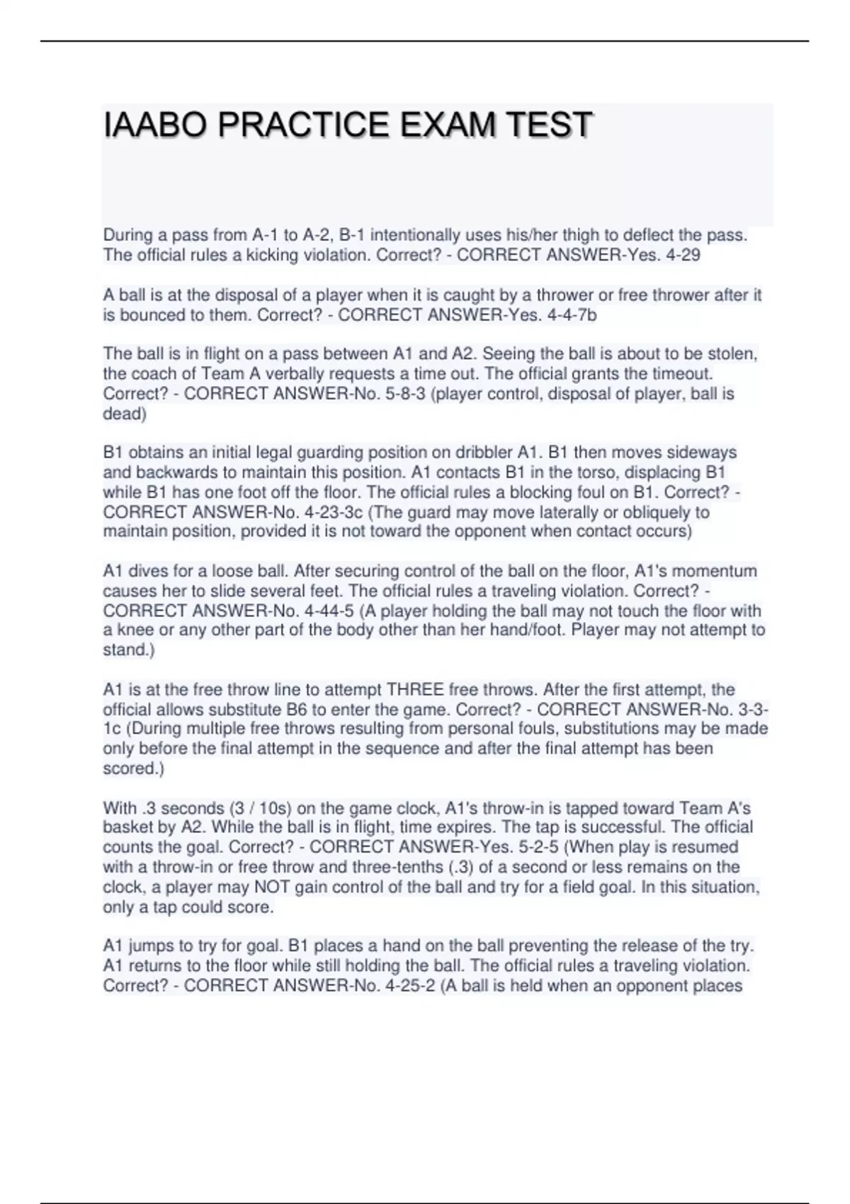 IAABO PRACTICE EXAM TEST During a pass from A-1 to A-2, B-1 intentionally uses his/her thigh to deflect the pass. The official rules a kicking violation. Correct? - CORRECT ANSWER-Yes. 4-29 A ball is at the disposal of a player when it is caught by a thrower or free thrower after it is bounced to them. Correct? - CORRECT ANSWER-Yes. 4-4-7b The ball is in flight on a pass between A1 and A2. Seeing the ball is about to be stolen, the coach of Team A verbally requests a time out. The official grants the timeout. Correct? - CORRECT ANSWER-No. 5-8-3 (player control, disposal of player, ball is dead) B1 obtains an initial legal guarding position on dribbler A1. B1 then moves sideways and backwards to maintain this position. A1 contacts B1 in the torso, displacing B1 while B1 has one foot off the floor. The official rules a blocking foul on B1. Correct? - CORRECT ANSWER-No. 4-23-3c (The guard may move laterally or obliquely to maintain position, provided it is not toward the opponent when contact occurs) A1 dives for a loose ball. After securing control of the ball on the floor, A1's momentum causes her to slide several feet. The official rules a traveling violation. Correct? - CORRECT ANSWER-No. 4-44-5 (A player holding the ball may not touch the floor with a knee or any other part of the body other than her hand/foot. Player may not attempt to stand.) A1 is at the free throw line to attempt THREE free throws. After the first attempt, the official allows substitute B6 to enter the game. Correct? - CORRECT ANSWER-No. 3-3- 1c (During multiple free throws resulting from personal fouls, substitutions may be made only before the final attempt in the sequence and after the final attempt has been scored.) With .3 seconds (3 / 10s) on the game clock, A1's throw-in is tapped toward Team A's basket by A2. While the ball is in flight, time expires. The tap is successful. The official counts the goal. Correct? - CORRECT ANSWER-Yes. 5-2-5 (When play is resumed with a throw-in or free throw and three-tenths (.3) of a second or less remains on the clock, a player may NOT gain control of the ball and try for a field goal. In this situation, only a tap could score. A1 jumps to try for goal. B1 places a hand on the ball preventing the release of the try. A1 returns to the floor while still holding the ball. The official rules a traveling violation. Correct? - CORRECT ANSWER-No. 4-25-2 (A ball is held when an opponent places her hand(s) on the ball and prevents an *airborne* player from throwing the ball or releasing it on a try or tap for field goal. While A1 is dribbling, B1 bats the ball away from A1. That player, A1, then recovers the ball with both hands and begins dribbling again. The official rules an illegal dribble. Correct? - CORRECT ANSWER-No. 9-5-2 & 4-15-4d. (9-5-2: A player shall not dribble a 2nd time unless she has lost control because it was touched by an opponent.) ; (4-15- 4d: The dribble ends when the ball touches or is touched by an opponent and causes the dribbler to lose control.) While the ball is at the disposal of a player for a throw-in, the ball is dead. Correct? - CORRECT ANSWER-No. 6-1-2b (The ball becomes live when at the disposal of a player on a throw-in) Any player may attempt the free throws for a technical foul, including an eligible substitute. Correct? - CORRECT ANSWER-Yes. 8-3 (TF free throws may be attempted by any player of the offended team, including an eligible sub or designated starter. The coach or captain shall designate the free thrower) On a try by A1, B1 jumps within her vertical plane with arms straight up. Contact occurs that knocks B1 out of bounds. The official rules a player control foul on A1. Correct? - CORRECT ANSWER-Yes. 4-45-4 (The defender should not be penalized for leaving the floor vertically or having her hands and arms extended within her vertical plane.) A1, closely guarded in the frontcourt, dribbles the ball for 4 seconds and then catches the ball. The official continues the five-second count. Correct? - CORRECT ANSWERNo. 4-10 & 9-10-1a (4-10: A closely guarded count occurs when a player in control of the ball in the frontcourt is continuously guarded by *any* opponent who is within 6 feet of the player who is holding or dribbling the ball.) ; (9-10-1a: A player shall not, while closely guarded in the team's front court, hold or dribble the ball for 5 seconds.) An intentional personal foul is ruled against A1 near the basket. Following the free throws, the official awards a throw-in to Team B at the division line opposite the table. Correct? - CORRECT ANSWER-No. 4-19-3 & 7-5-4b (4-19-3: definition of an intentional personal foul) ; (7-5-4b: After an intentional foul or flagrant personal foul, any player from the team to whom the free throws have been awarded shall make the throw-in at the designated out-of-bounds throw-in spot nearest the foul.) A1 receives the ball while in the air. A1 lands simultaneously on both feet and then pivots prior to passing to a teammate. The official rules a legal play. Correct? - CORRECT ANSWER-Yes 4-44-2a1 (If both of a player's feet are off the floor when she gains possession of the ball and lands simultaneously on both feet, either foot may be the pivot)