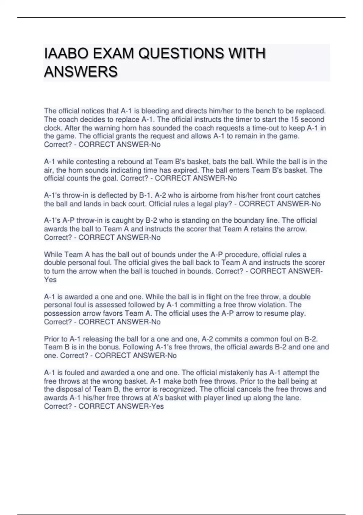 IAABO EXAM QUESTIONS WITH ANSWERS The official notices that A-1 is bleeding and directs him/her to the bench to be replaced. The coach decides to replace A-1. The official instructs the timer to start the 15 second clock. After the warning horn has sounded the coach requests a time-out to keep A-1 in the game. The official grants the request and allows A-1 to remain in the game. Correct? - CORRECT ANSWER-No A-1 while contesting a rebound at Team B's basket, bats the ball. While the ball is in the air, the horn sounds indicating time has expired. The ball enters Team B's basket. The official counts the goal. Correct? - CORRECT ANSWER-No A-1's throw-in is deflected by B-1. A-2 who is airborne from his/her front court catches the ball and lands in back court. Official rules a legal play? - CORRECT ANSWER-No A-1's A-P throw-in is caught by B-2 who is standing on the boundary line. The official awards the ball to Team A and instructs the scorer that Team A retains the arrow. Correct? - CORRECT ANSWER-No While Team A has the ball out of bounds under the A-P procedure, official rules a double personal foul. The official gives the ball back to Team A and instructs the scorer to turn the arrow when the ball is touched in bounds. Correct? - CORRECT ANSWERYes A-1 is awarded a one and one. While the ball is in flight on the free throw, a double personal foul is assessed followed by A-1 committing a free throw violation. The possession arrow favors Team A. The official uses the A-P arrow to resume play. Correct? - CORRECT ANSWER-No Prior to A-1 releasing the ball for a one and one, A-2 commits a common foul on B-2. Team B is in the bonus. Following A-1's free throws, the official awards B-2 and one and one. Correct? - CORRECT ANSWER-No A-1 is fouled and awarded a one and one. The official mistakenly has A-1 attempt the free throws at the wrong basket. A-1 make both free throws. Prior to the ball being at the disposal of Team B, the error is recognized. The official cancels the free throws and awards A-1 his/her free throws at A's basket with player lined up along the lane. Correct? - CORRECT ANSWER-Yes