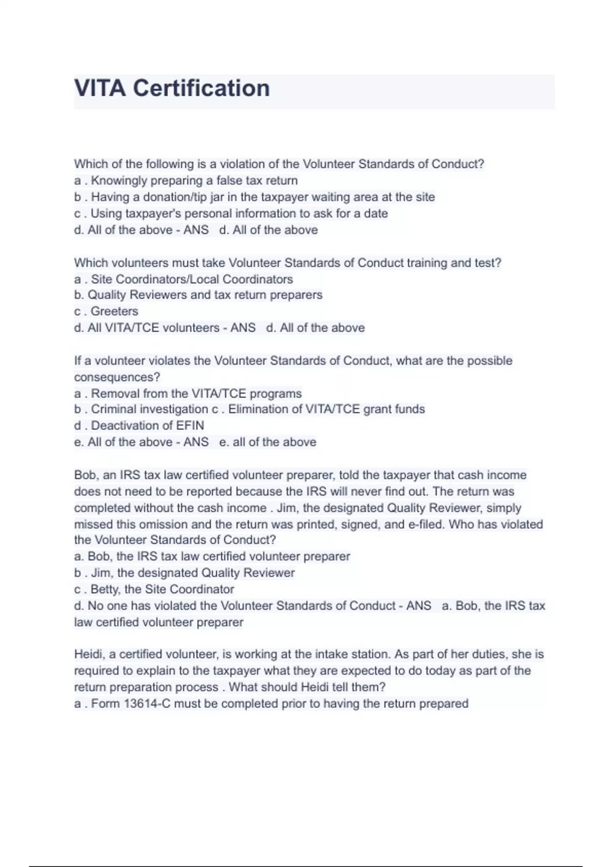 VITA Certification Exam Questions And Answers Which of the following is a violation of the Volunteer Standards of Conduct? a . Knowingly preparing a false tax return b . Having a donation/tip jar in the taxpayer waiting area at the site c . Using taxpayer's personal information to ask for a date d. All of the above - ANS d. All of the above Which volunteers must take Volunteer Standards of Conduct training and test? a . Site Coordinators/Local Coordinators b. Quality Reviewers and tax return preparers c . Greeters d. All VITA/TCE volunteers - ANS d. All of the above If a volunteer violates the Volunteer Standards of Conduct, what are the possible consequences? a . Removal from the VITA/TCE programs b . Criminal investigation c . Elimination of VITA/TCE grant funds d . Deactivation of EFIN e. All of the above - ANS e. all of the above Bob, an IRS tax law certified volunteer preparer, told the taxpayer that cash income does not need to be reported because the IRS will never find out. The return was completed without the cash income . Jim, the designated Quality Reviewer, simply missed this omission and the return was printed, signed, and e-filed. Who has violated the Volunteer Standards of Conduct? a. Bob, the IRS tax law certified volunteer preparer b . Jim, the designated Quality Reviewer c . Betty, the Site Coordinator d. No one has violated the Volunteer Standards of Conduct - ANS a. Bob, the IRS tax law certified volunteer preparer Heidi, a certified volunteer, is working at the intake station. As part of her duties, she is required to explain to the taxpayer what they are expected to do today as part of the return preparation process . What should Heidi tell them? a . Form 13614-C must be completed prior to having the return prepared b . You will be interviewed by the return preparer and asked additional questions as needed c. You need to participate in a quality review of your tax return by someone other than the return preparer d. All of the above - ANS d. All of the above