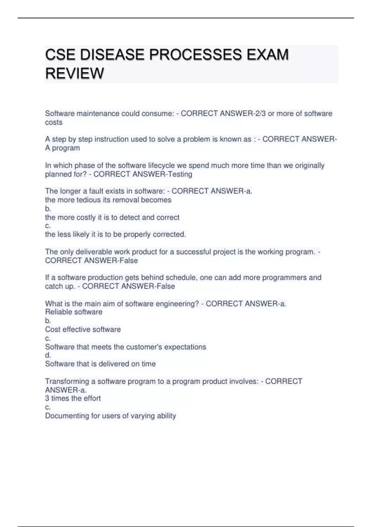 CSE DISEASE PROCESSES EXAM REVIEW Software maintenance could consume: - CORRECT ANSWER-2/3 or more of software costs A step by step instruction used to solve a problem is known as : - CORRECT ANSWERA program In which phase of the software lifecycle we spend much more time than we originally planned for? - CORRECT ANSWER-Testing The longer a fault exists in software: - CORRECT ANSWER-a. the more tedious its removal becomes b. the more costly it is to detect and correct c. the less likely it is to be properly corrected. The only deliverable work product for a successful project is the working program. - CORRECT ANSWER-False If a software production gets behind schedule, one can add more programmers and catch up. - CORRECT ANSWER-False What is the main aim of software engineering? - CORRECT ANSWER-a. Reliable software b. Cost effective software c. Software that meets the customer's expectations d. Software that is delivered on time Transforming a software program to a program product involves: - CORRECT ANSWER-a. 3 times the effort c. Documenting for users of varying ability Software Engineering is defined as a systematic, disciplined and quantifiable approach for the development, operation and maintenance of software. - CORRECT ANSWERTrue Software engineering is multi-[___] development of multi-[____] software. - CORRECT ANSWER-person, version A "Software Design Document": - CORRECT ANSWER-a. Is a product of software design activity b. Describes the decomposition of a software system into modules What is desirable for each module in a software system? - CORRECT ANSWER-Low fan-out, high fan-in Software product families promote strategic, planned reuse that might very well include reuse of all of the following except for: - CORRECT ANSWER-user documentation and product-specific features Hierarchical USES relationship: - CORRECT ANSWER-a. Improves the understandability of software b. Eliminates cyclic dependencies among the modules c. Makes it easier to separate concerns d. Can be represented as a Directed Acyclic Graph Which one of the following changes is the hardest to anticipate/predict? - CORRECT ANSWER-Changes to the social environment The cardinality of a relationship between software modules: - CORRECT ANSWER-a. Should be as low as possible b. Can never be null d. is n*n, if the relationship is complete Change in the data representation: - CORRECT ANSWER-a. Involves replacing an inefficient data structure with an efficient one b. May be necessary to accommodate changes in the algorithm c. Constitute about 17% of the total maintenance costs d. May be necessary to improve performance