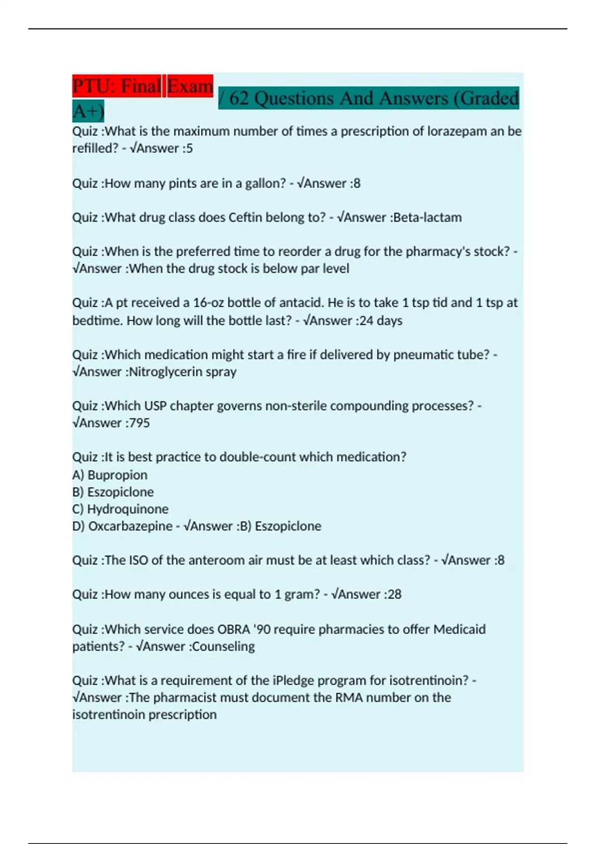 Quiz :What is the maximum number of times a prescription of lorazepam an be refilled? - √Answer :5 Quiz :How many pints are in a gallon? - √Answer :8 Quiz :What drug class does Ceftin belong to? - √Answer :Beta-lactam Quiz :When is the preferred time to reorder a drug for the pharmacy's stock? - √Answer :When the drug stock is below par level Quiz :A pt received a 16-oz bottle of antacid. He is to take 1 tsp tid and 1 tsp at bedtime. How long will the bottle last? - √Answer :24 days Quiz :Which medication might start a fire if delivered by pneumatic tube? - √Answer :Nitroglycerin spray Quiz :Which USP chapter governs non-sterile compounding processes? - √Answer :795 Quiz :It is best practice to double-count which medication? A) Bupropion B) Eszopiclone C) Hydroquinone D) Oxcarbazepine - √Answer :B) Eszopiclone Quiz :The ISO of the anteroom air must be at least which class? - √Answer :8 Quiz :How many ounces is equal to 1 gram? - √Answer :28 Quiz :Which service does OBRA '90 require pharmacies to offer Medicaid patients? - √Answer :Counseling Quiz :What is a requirement of the iPledge program for isotrentinoin? - √Answer :The pharmacist must document the RMA number on the isotrentinoin prescription