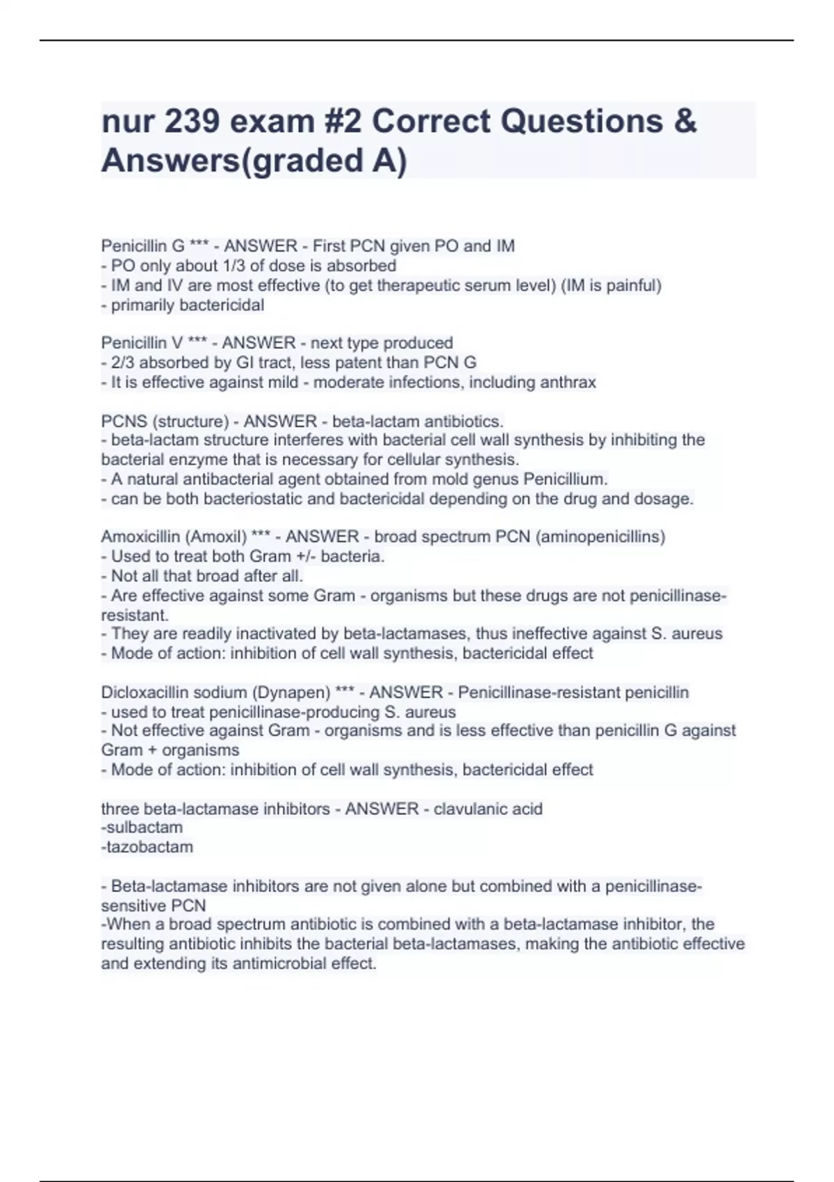 nur 239 exam #2 Correct Questions & Answers(graded A) nur 239 exam #2 Correct Questions & Answers(graded A) Penicillin G *** - ANSWER - First PCN given PO and IM - PO only about 1/3 of dose is absorbed - IM and IV are most effective (to get therapeutic serum level) (IM is painful) - primarily bactericidal Penicillin V *** - ANSWER - next type produced - 2/3 absorbed by GI tract, less patent than PCN G - It is effective against mild - moderate infections, including anthrax PCNS (structure) - ANSWER - beta-lactam antibiotics. - beta-lactam structure interferes with bacterial cell wall synthesis by inhibiting the bacterial enzyme that is necessary for cellular synthesis. - A natural antibacterial agent obtained from mold genus Penicillium. - can be both bacteriostatic and bactericidal depending on the drug and dosage. Amoxicillin (Amoxil) *** - ANSWER - broad spectrum PCN (aminopenicillins) - Used to treat both Gram +/- bacteria. - Not all that broad after all. - Are effective against some Gram - organisms but these drugs are not penicillinase-resistant. - They are readily inactivated by beta-lactamases, thus ineffective against S. aureus - Mode of action: inhibition of cell wall synthesis, bactericidal effect Dicloxacillin sodium (Dynapen) *** - ANSWER - Penicillinase-resistant penicillin - used to treat penicillinase-producing S. aureus - Not effective against Gram - organisms and is less effective than penicillin G against Gram + organisms - Mode of action: inhibition of cell wall synthesis, bactericidal effect three beta-lactamase inhibitors - ANSWER - clavulanic acid -sulbactam -tazobactam - Beta-lactamase inhibitors are not given alone but combined with a penicillinase-