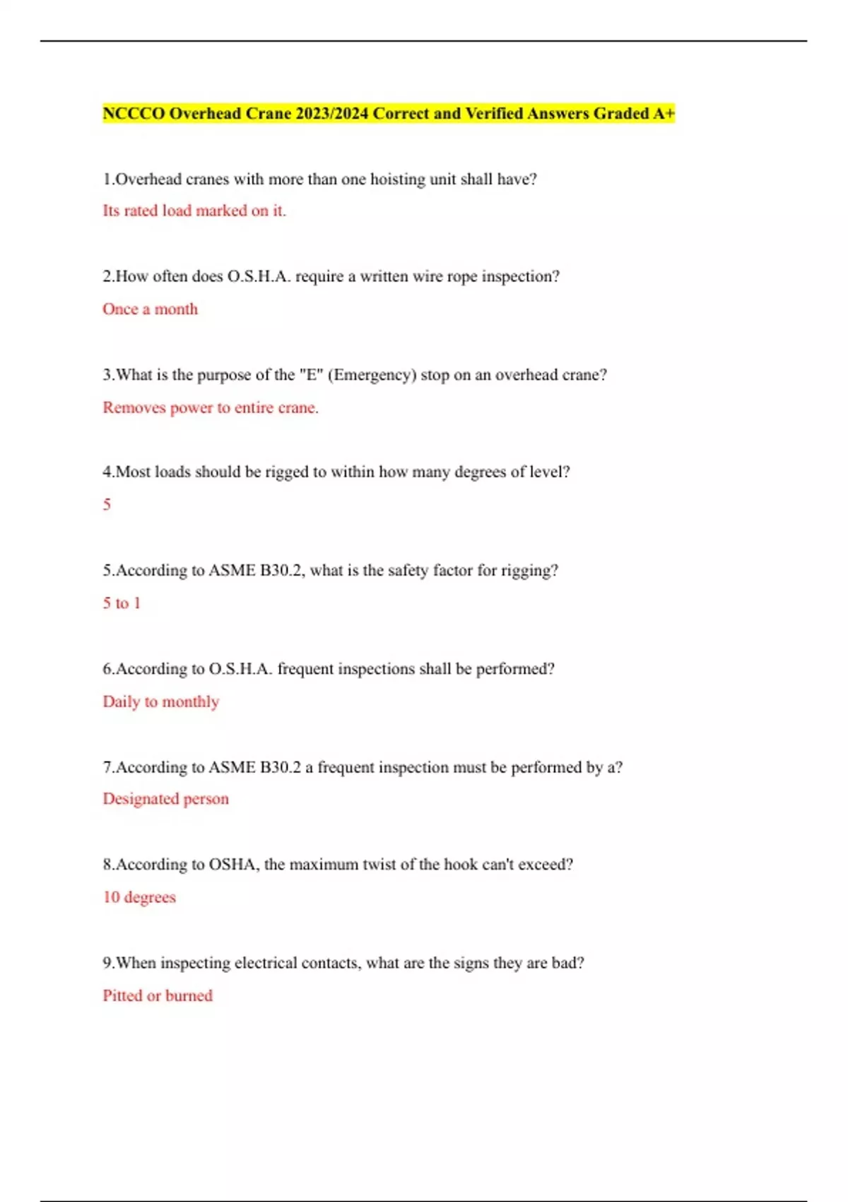 NCCCO Overhead Crane 2023/2024 Correct and Verified Answers Graded A+
