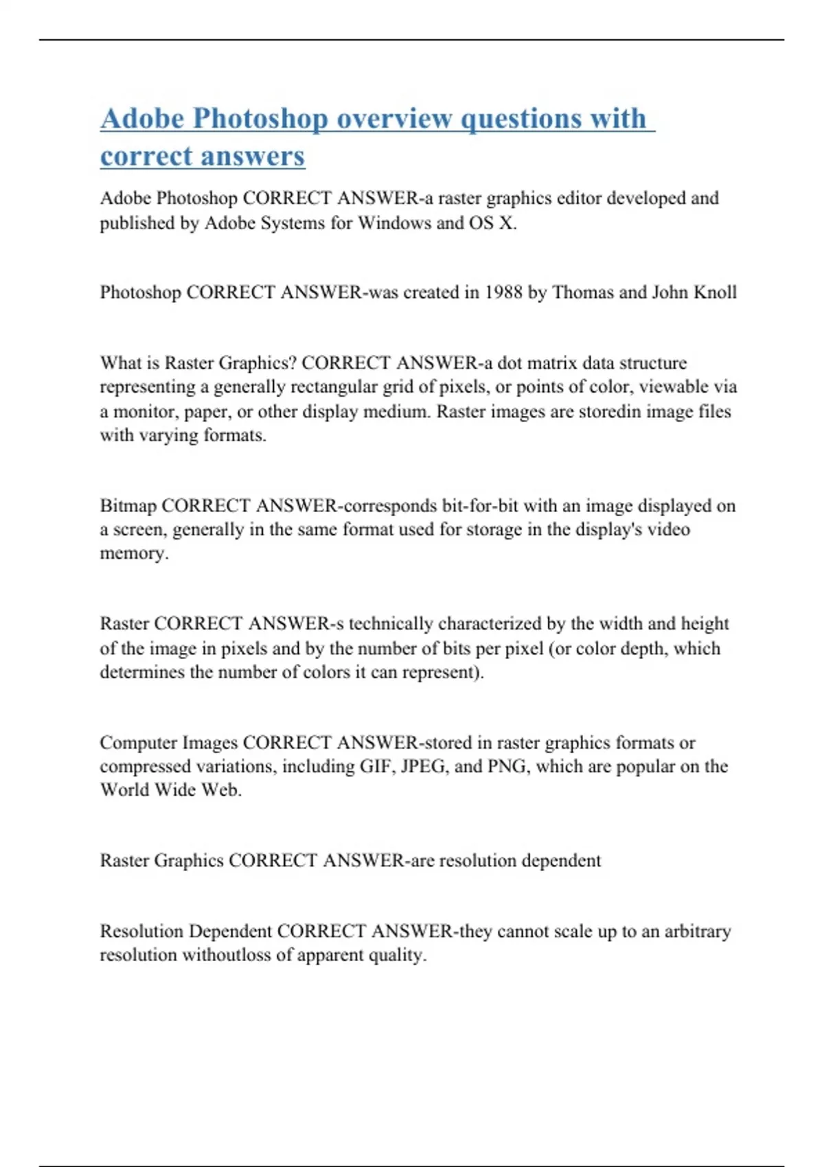 Adobe Photoshop CORRECT ANSWER-a raster graphics editor developed and published by Adobe Systems for Windows and OS X. Photoshop CORRECT ANSWER-was created in 1988 by Thomas and John Knoll What is Raster Graphics? CORRECT ANSWER-a dot matrix data structure representing a generally rectangular grid of pixels, or points of color, viewable via a monitor, paper, or other display medium. Raster images are storedin image files with varying formats. Bitmap CORRECT ANSWER-corresponds bit-for-bit with an image displayed on a screen, generally in the same format used for storage in the display's video memory. Raster CORRECT ANSWER-s technically characterized by the width and height of the image in pixels and by the number of bits per pixel (or color depth, which determines the number of colors it can represent). Computer Images CORRECT ANSWER-stored in raster graphics formats or compressed variations, including GIF, JPEG, and PNG, which are popular on the World Wide Web. Raster Graphics CORRECT ANSWER-are resolution dependent Resolution Dependent CORRECT ANSWER-they cannot scale up to an arbitrary resolution withoutloss of apparent quality.