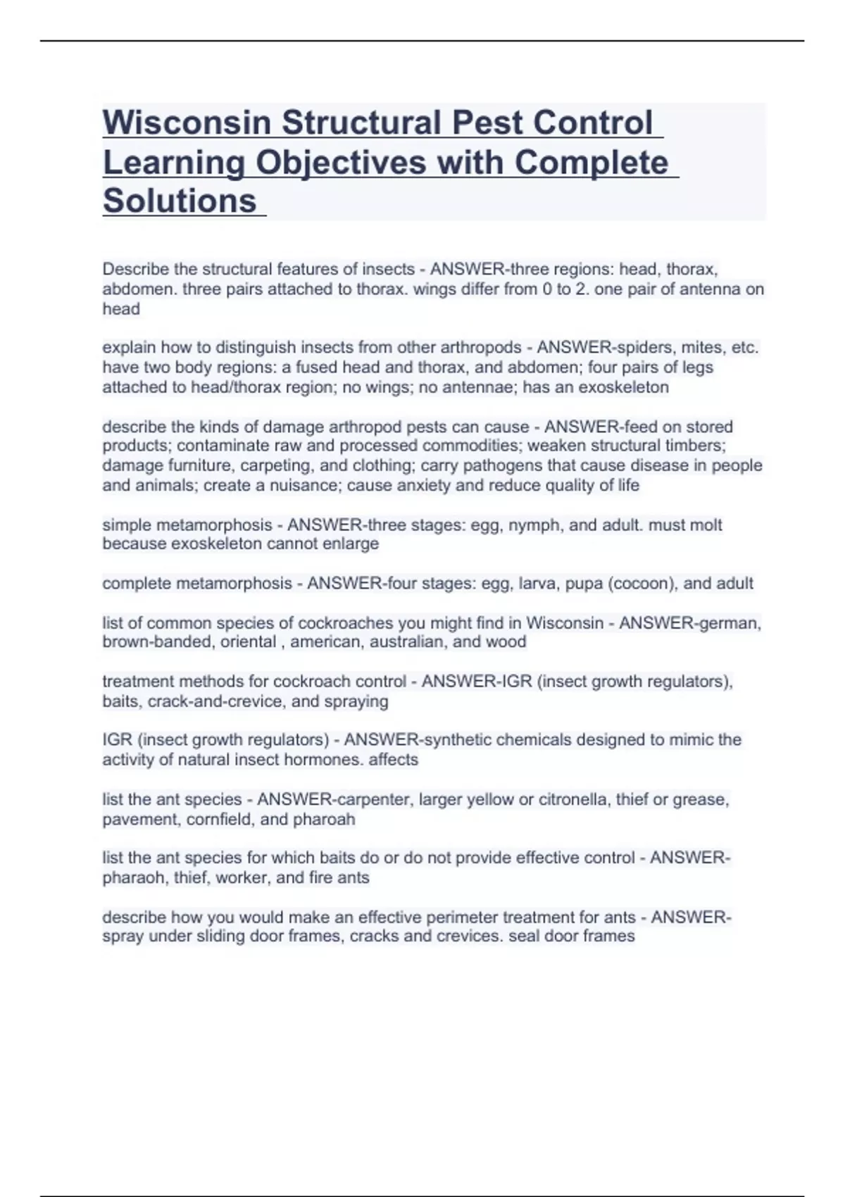 Wisconsin Structural Pest Control Learning Objectives with Complete Solutions Wisconsin Structural Pest Control Learning Objectives with Complete Solutions Wisconsin Structural Pest Control Learning Objectives with Complete Solutions Wisconsin Structural Pest Control Learning Objectives with Complete Solutions Describe the structural features of insects - ANSWER-three regions: head, thorax, abdomen. three pairs attached to thorax. wings differ from 0 to 2. one pair of antenna on head explain how to distinguish insects from other arthropods - ANSWER-spiders, mites, etc. have two body regions: a fused head and thorax, and abdomen; four pairs of legs attached to head/thorax region; no wings; no antennae; has an exoskeleton describe the kinds of damage arthropod pests can cause - ANSWER-feed on stored products; contaminate raw and processed commodities; weaken structural timbers; damage furniture, carpeting, and clothing; carry pathogens that cause disease in people