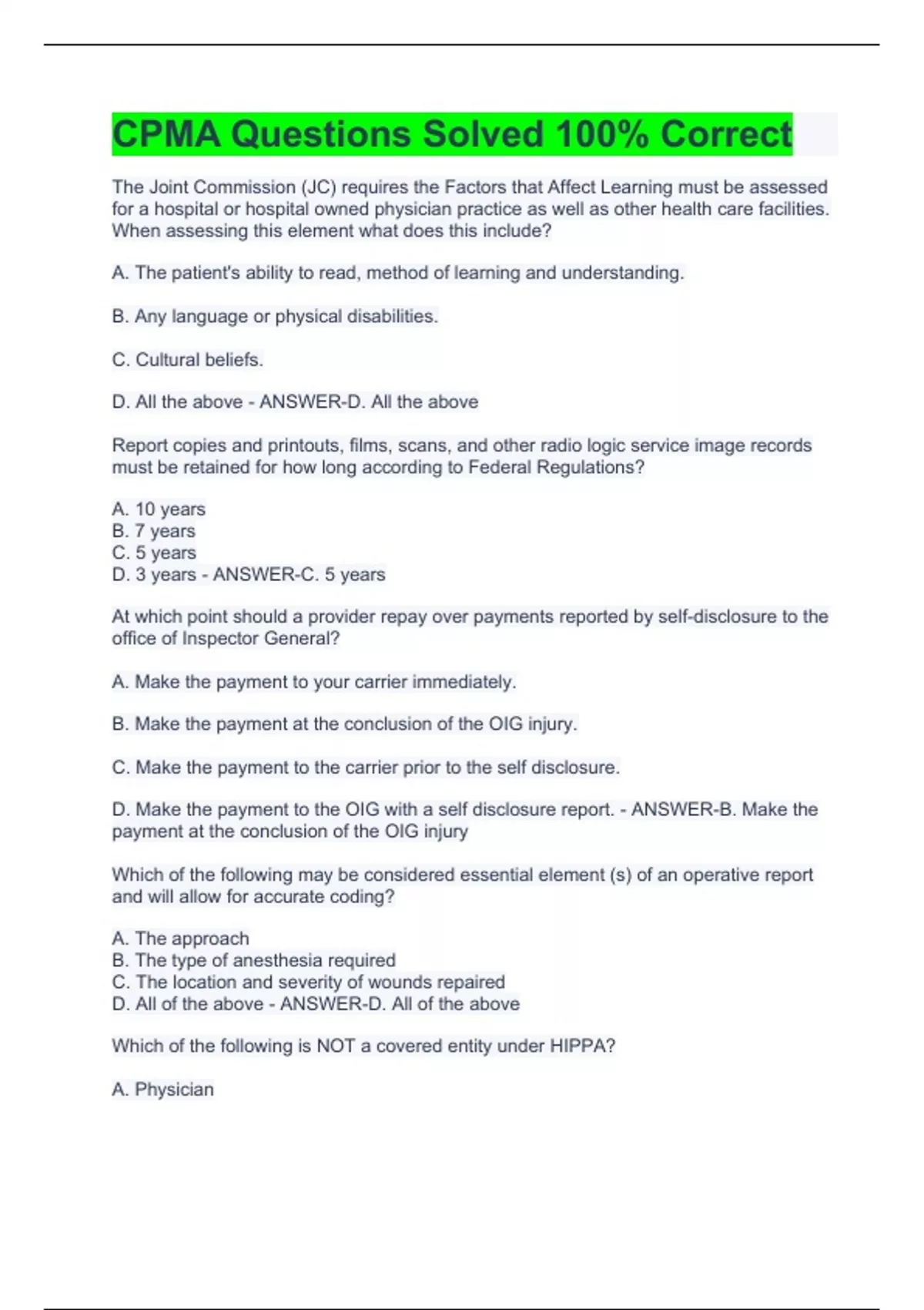 CMPA/AAPC CPMA Exams Package Deal- Solved