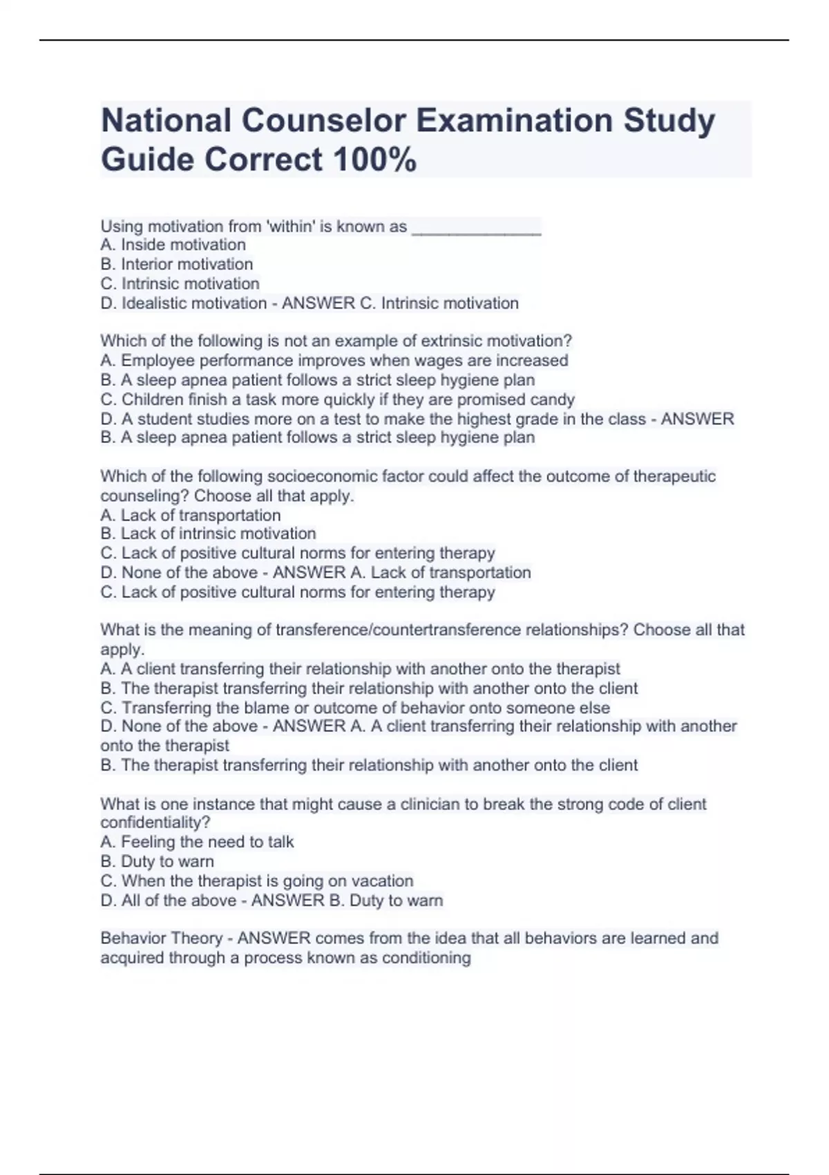 Using motivation from 'within' is known as ______________ A. Inside motivation B. Interior motivation C. Intrinsic motivation D. Idealistic motivation - ANSWER C. Intrinsic motivation Which of the following is not an example of extrinsic motivation? A. Employee performance improves when wages are increased B. A sleep apnea patient follows a strict sleep hygiene plan C. Children finish a task more quickly if they are promised candy D. A student studies more on a test to make the highest grade in the class - ANSWER B. A sleep apnea patient follows a strict sleep hygiene plan Which of the following socioeconomic factor could affect the outcome of therapeutic counseling? Choose all that apply. A. Lack of transportation B. Lack of intrinsic motivation C. Lack of positive cultural norms for entering therapy D. None of the above - ANSWER A. Lack of transportation C. Lack of positive cultural norms for entering therapy What is the meaning of transference/countertransference relationships? Choose all that apply. A. A client transferring their relationship with another onto the therapist B. The therapist transferring their relationship with another onto the client C. Transferring the blame or outcome of behavior onto someone else D. None of the above - ANSWER A. A client transferring their relationship with another onto the therapist B. The therapist transferring their relationship with another onto the client What is one instance that might cause a clinician to break the strong code of client confidentiality? A. Feeling the need to talk B. Duty to warn C. When the therapist is going on vacation D. All of the above - ANSWER B. Duty to warn Behavior Theory - ANSWER comes from the idea that all behaviors are learned and acquired through a process known as conditioning What theory is most often associated with the psychologists B.F. Skinner and John B. Watson? - ANSWER behavior theory Behavior Therapy - ANSWER concentrates on the observable behaviors of a person or group, and dismisses internal mental states Key components of Behavior theory: - ANSWER conditioning, reinforcement, and punishment What does behavioral theory NOT take into count? - ANSWER the concepts of emotion or even the unconscious or subconscious, as these states are subjective rather than objective Behaviorists believe that all behavior can be what? - ANSWER Trained Classical Conditioning - ANSWER a process in w