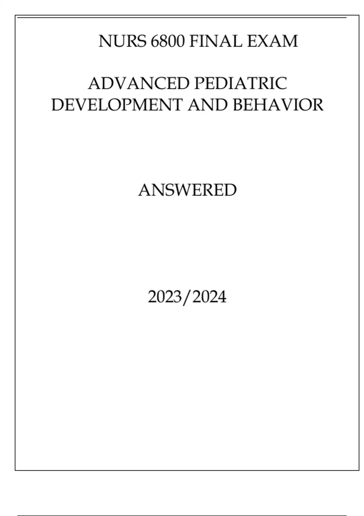 NURS 6800 FINAL EXAM ADVANCED PEDIATRIC DEVELOPMENT AND BEHAVIOR ANSWEREDNURS 6800 FINAL EXAM ADVANCED PEDIATRIC DEVELOPMENT AND BEHAVIOR ANSWERED