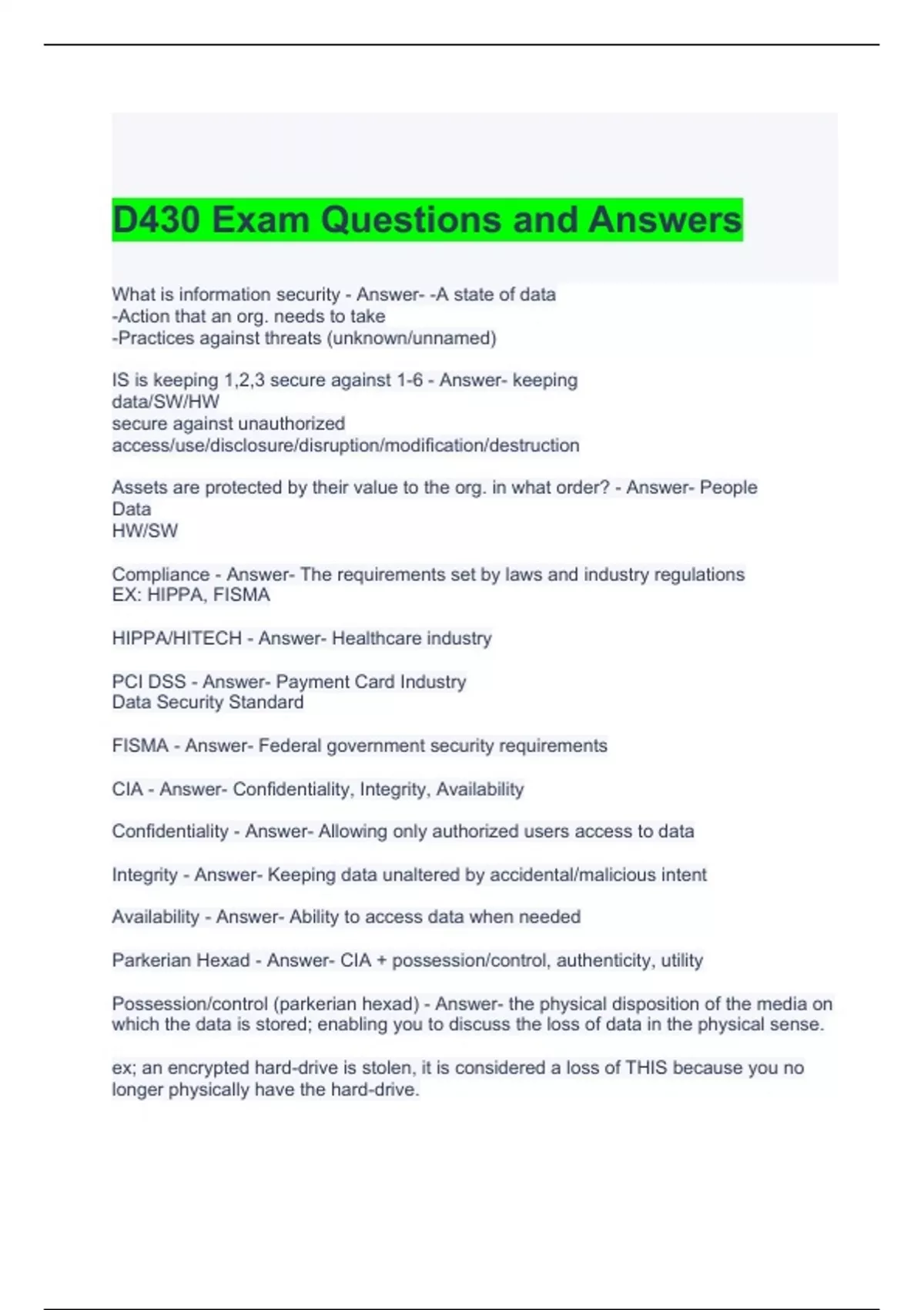 D430 Exam Questions and Answers