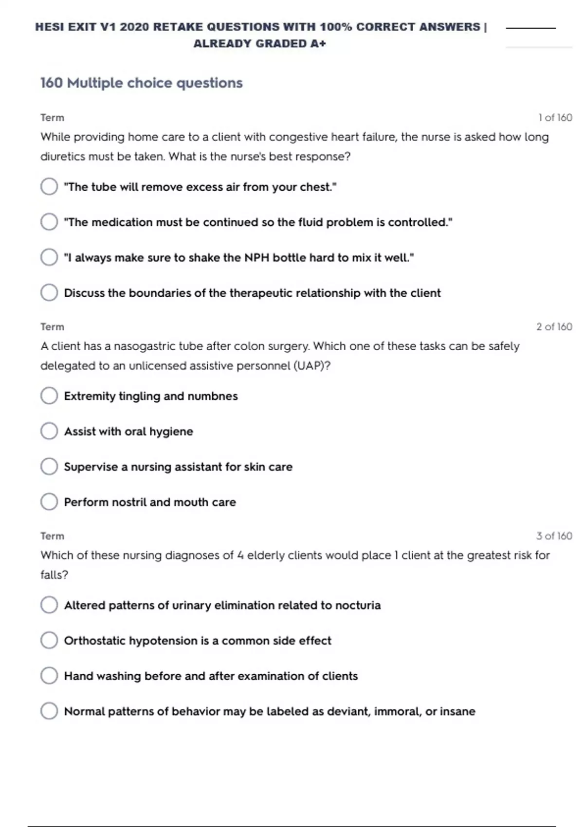 HESI EXIT V1 2020 RETAKE QUESTIONS WITH 100% CORRECT ANSWERS | ALREADY GRADED A+ While providing home care to a client with congestive heart failure, the nurse is asked how long diuretics must be taken. What is the nurse's best response? "The tube will remove excess air from your chest." "The medication must be continued so the fluid problem is controlled." "I always make sure to shake the NPH bottle hard to mix it well." Discuss the boundaries of the therapeutic relationship with the client