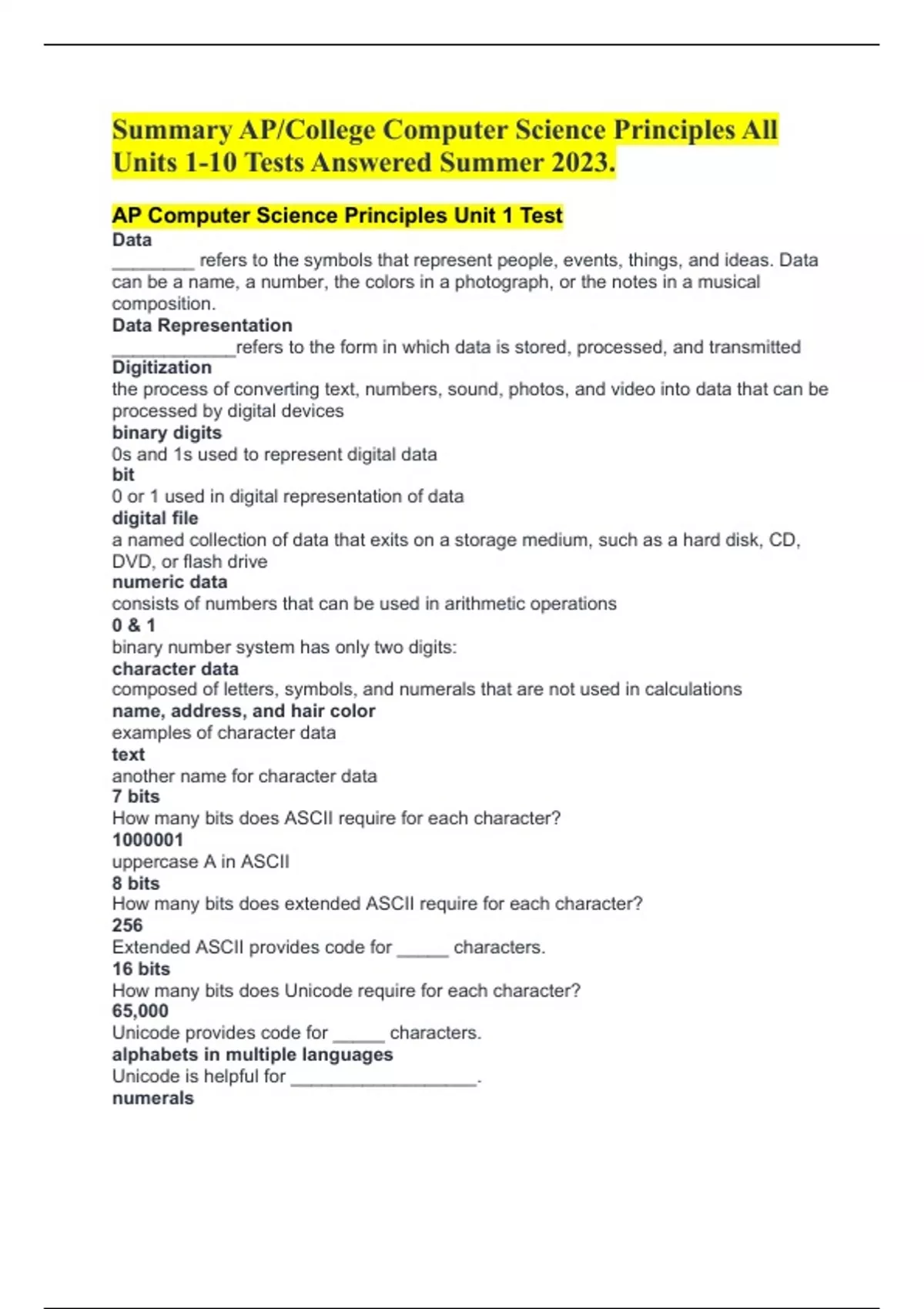 Summary AP/College Computer Science Principles All Units 1-10 Tests Answered Summer 2023. AP Computer Science Principles Unit 1 Test Data ________ refers to the symbols that represent people, events, things, and ideas. Data can be a name, a number, the colors in a photograph, or the notes in a musical composition. Data Representation ____________refers to the form in which data is stored, processed, and transmitted Digitization the process of converting text, numbers, sound, photos, and video into data that can be processed by digital devices binary digits 0s and 1s used to represent digital data bit 0 or 1 used in digital representation of data digital file a named collection of data that exits on a storage medium, such as a hard disk, CD, DVD, or flash drive numeric data consists of numbers that can be used in arithmetic operations 0 & 1 binary number system has only two digits: character data composed of letters, symbols, and numerals that are not used in calculations name, address, and hair color examples of character data text another name for character data 7 bits How many bits does ASCII require for each character? 1000001 uppercase A in ASCII 8 bits How many bits does extended ASCII require for each character? 256 Extended ASCII provides code for _____ characters. 16 bits How many bits does Unicode require for each character? 65,000