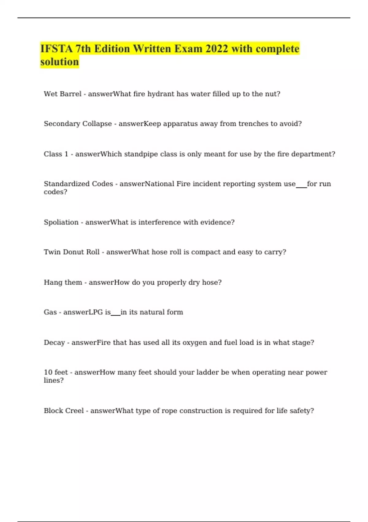 IFSTA 7th Edition Written Exam 2022 with complete solution Wet Barrel - answerWhat fire hydrant has water filled up to the nut? Secondary Collapse - answerKeep apparatus away from trenches to avoid? Class 1 - answerWhich standpipe class is only meant for use by the fire department? Standardized Codes - answerNational Fire incident reporting system use for run codes? Spoliation - answerWhat is interference with evidence? Twin Donut Roll - answerWhat hose roll is compact and easy to carry? Hang them - answerHow do you properly dry hose? Gas - answerLPG is in its natural form Decay - answerFire that has used all its oxygen and fuel load is in what stage? 10 feet - answerHow many feet should your ladder be when operating near power lines? Block Creel - answerWhat t