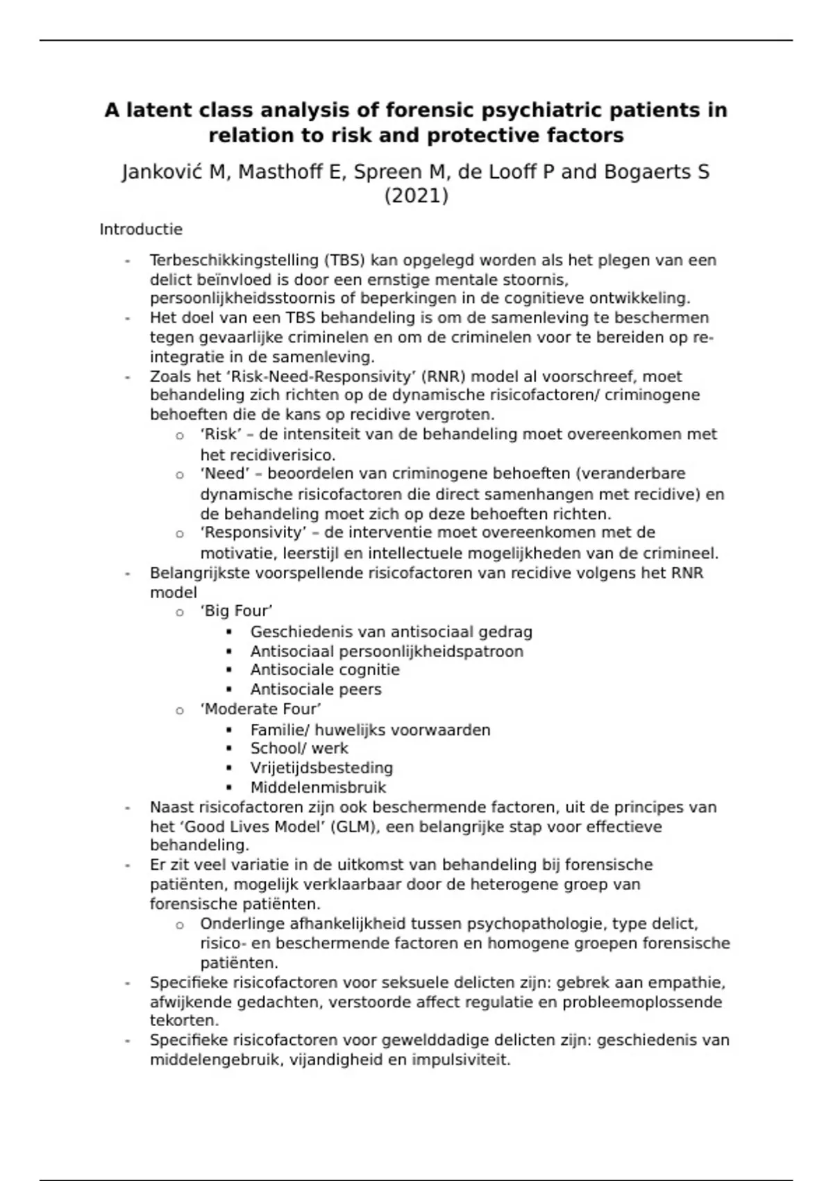 Dit document is een samenvatting van het artikel 'A latent class analysis of forensic psychiatric patients in relation to risk and protective factors' door Janković M, Masthoff E, Spreen M, de Looff P and Bogaerts S (2021). Dit artikel is verplichte leerstof voor het tentamen 2023/2024 van het vak Forensische Psychopathologie aan Tilburg University.