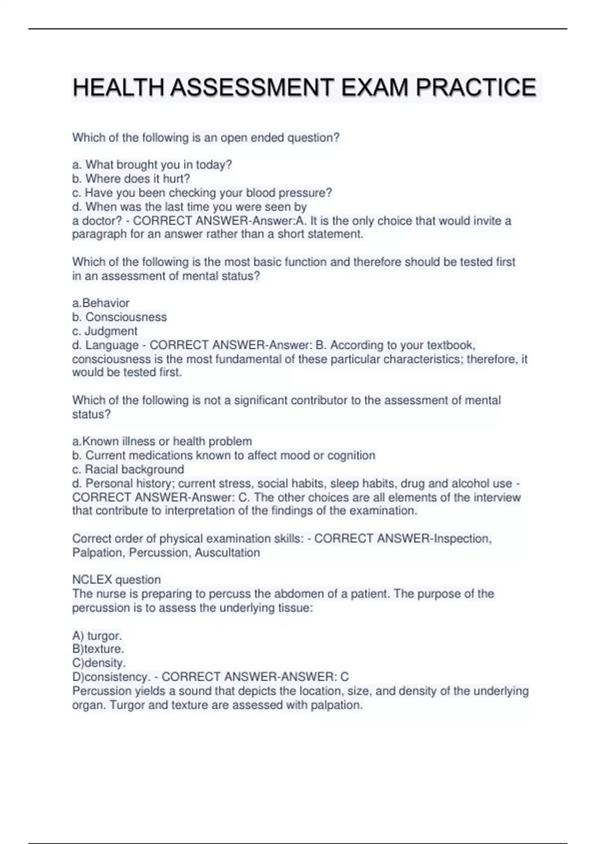 HEALTH ASSESSMENT EXAM PRACTICE Which of the following is an open ended question? a. What brought you in today? b. Where does it hurt? c. Have you been checking your blood pressure? d. When was the last time you were seen by a doctor? - CORRECT ANSWER-Answer:A. It is the only choice that would invite a paragraph for an answer rather than a short statement. Which of the following is the most basic function and therefore should be tested first in an assessment of mental status? a.Behavior b. Consciousness c. Judgment d. Language - CORRECT ANSWER-Answer: B. According to your textbook, consciousness is the most fundamental of these particular characteristics; therefore, it would be tested first. Which of the following is not a significant contributor to the assessment of mental status? a.Known illness or health problem b. Current medications known to affect mood or cognition c. Racial background d. Personal history; current stress, social habits, sleep habits, drug and alcohol use - CORRECT ANSWER-Answer: C. The other choices are all elements of the interview that contribute to interpretation of the findings of the examination. Correct order of physical examination skills: - CORRECT ANSWER-Inspection, Palpation, Percussion, Auscultation NCLEX question The nurse is preparing to percuss the abdomen of a patient. The purpose of the percussion is to assess the underlying tissue: A) turgor. B)texture. C)density. D)consistency. - CORRECT ANSWER-ANSWER: C Percussion yields a sound that depicts the location, size, and density of the underlying organ. Turgor and texture are assessed with palpation. NCLEX question The nurse is reviewing percussion techniques with a newly graduated nurse. Which technique, if used by the new nurse, indicates that more review is needed? The nurse: A)percusses once over each area. B)lifts the striking finger off quickly after each stroke. C)strikes with the finger tip, not the finger pad. D)uses the wrist to make the strikes, not the arm. - CORRECT ANSWER-ANSWER: A For percussion, the nurse should percuss two times over each location. The striking finger should be lifted off quickly because a resting finger damps off vibrations. The tip of the striking finger should make contact, not the pad of the finger. The wrist must be relaxed, and it is used to make the strikes, not the arm NCLEX question The nurse is teaching a class on basic assessment skills. Which of these statements is true regarding the stethoscope and its use? A)The slope of the earpieces should point posteriorly (toward the occiput). B)The stethoscope does not magnify sound but does block out extraneous room noise. C)The fit and quality of the stethoscope are not as important as its ability to magnify sound. D)The ideal tubing length should be 22 inches to dampen distortion of sound. - CORRECT ANSWER-ANSWER: B The stethoscope does not magnify sound but does block out extraneous room sounds. The slope of the earpieces should point forward toward the examiner's nose. Longer tubing will distort sound. The fit and quality of the stethoscope are important. NCLEX question The nurse is unable to palpate the right radial pulse on a patient. The best action would be to: A)auscultate over the area with a fetoscope. B)use a goniometer to measure the pulsations. C)use a Doppler device to check for pulsations over the area. D)check for the presence of pulsations with a stethoscope. - CORRECT ANSWERANSWER: C Doppler devices are used to augment pulse or blood pressure measurements. Goniometers measure joint range of motion. A fetoscope is used to auscultate fetal heart tones. Stethoscopes are used to auscultate breath, bowel, and heart sounds. NCLEX question When performing a physical examination, safety must be considered to protect the examiner and the patient against the spread of infection. Which of these statements describes the most appropriate action the nurse should take when performing a physical examination?