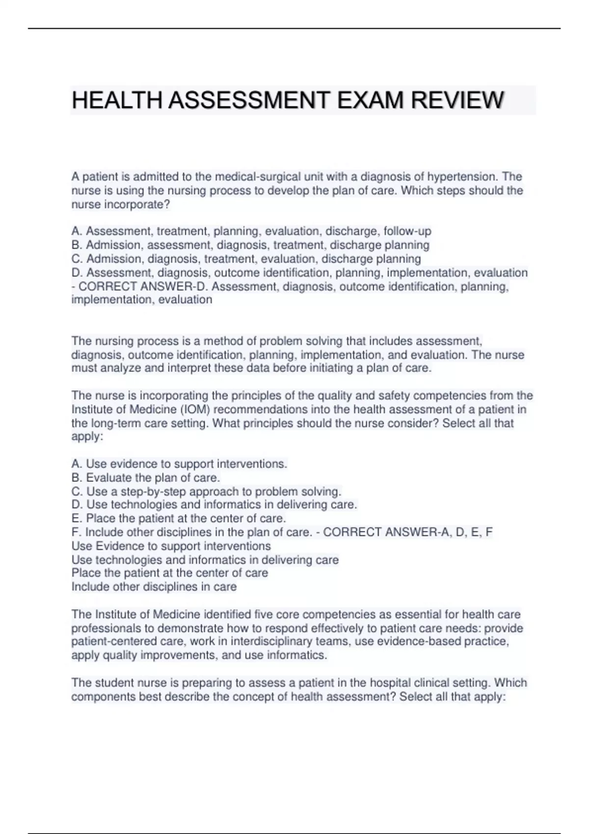 HEALTH ASSESSMENT EXAM REVIEW A patient is admitted to the medical-surgical unit with a diagnosis of hypertension. The nurse is using the nursing process to develop the plan of care. Which steps should the nurse incorporate? A. Assessment, treatment, planning, evaluation, discharge, follow-up B. Admission, assessment, diagnosis, treatment, discharge planning C. Admission, diagnosis, treatment, evaluation, discharge planning D. Assessment, diagnosis, outcome identification, planning, implementation, evaluation - CORRECT ANSWER-D. Assessment, diagnosis, outcome identification, planning, implementation, evaluation The nursing process is a method of problem solving that includes assessment, diagnosis, outcome identification, planning, implementation, and evaluation. The nurse must analyze and interpret these data before initiating a plan of care. The nurse is incorporating the principles of the quality and safety competencies from the Institute of Medicine (IOM) recommendations into the health assessment of a patient in the long-term care setting. What principles should the nurse consider? Select all that apply: A. Use evidence to support interventions. B. Evaluate the plan of care. C. Use a step-by-step approach to problem solving. D. Use technologies and informatics in delivering care. E. Place the patient at the center of care. F. Include other disciplines in the plan of care. - CORRECT ANSWER-A, D, E, F Use Evidence to support interventions Use technologies and informatics in delivering care Place the patient at the center of care Include other disciplines in care The Institute of Medicine identified five core competencies as essential for health care professionals to demonstrate how to respond effectively to patient care needs: provide patient-centered care, work in interdisciplinary teams, use evidence-based practice, apply quality improvements, and use informatics. The student nurse is preparing to assess a patient in the hospital clinical setting. Which components best describe the concept of health assessment? Select all that apply: A. Collection of objective data B. Collection of subjective data C. Collection of data and identification of nursing diagnosis D. Planning and evaluation of data E. Analysis of data F. Physical exam G. Documentation of data - CORRECT ANSWER-A, B, F, G Collection of objective data Collection of subjective data Physical exam Documentation of Data Components of health assessment include conducting a health history (the collection of subjective data), performing a physical examination (the collection of objective data), and documenting the findings. The nurse is documenting the findings from the health assessment. Which example of data documentation reflects the opinion of the nurse? A. The patient is uncooperative and unfriendly. B. The patient avoids eye contact. C. The patient states, "I do not want to get out of bed." D. The patient states, "I am very angry." - CORRECT ANSWER-A. The patient is uncooperative and unfriendly Nurses must record data accurately, concisely, and without bias or opinion. In this example, the nurse is offering an opinion, which may contain bias. The nurse is assessing a patient for the first time in the outpatient diabetic clinic. A ____________ type of health assessment would be most appropriate for this visit? A. Focused assessment B. Episodic follow-up assessment C. Shift assessment D. Comprehensive health assessment - CORRECT ANSWER-D. Comprehensive health assessment The type of health assessment performed by the nurse is also driven by patient need. A comprehensive health assessment involves a detailed history and physical examination performed at the onset of care in a primary care setting or upon admission to a hospital or long-term care facility.