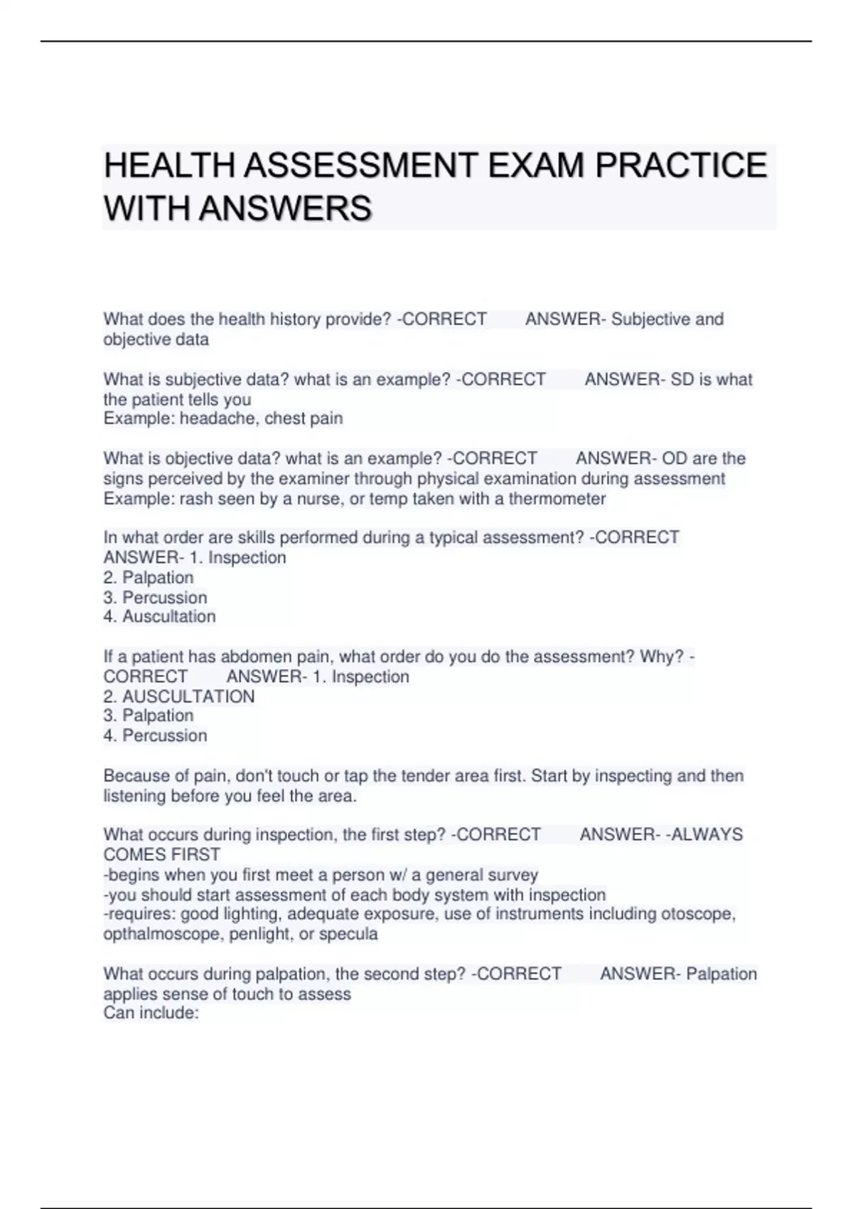 HEALTH ASSESSMENT EXAM PRACTICE WITH ANSWERS What does the health history provide? -CORRECT ANSWER- Subjective and objective data What is subjective data? what is an example? -CORRECT ANSWER- SD is what the patient tells you Example: headache, chest pain What is objective data? what is an example? -CORRECT ANSWER- OD are the signs perceived by the examiner through physical examination during assessment Example: rash seen by a nurse, or temp taken with a thermometer In what order are skills performed during a typical assessment? -CORRECT ANSWER- 1. Inspection 2. Palpation 3. Percussion 4. Auscultation If a patient has abdomen pain, what order do you do the assessment? Why? - CORRECT ANSWER- 1. Inspection 2. AUSCULTATION 3. Palpation 4. Percussion Because of pain, don't touch or tap the tender area first. Start by inspecting and then listening before you feel the area. What occurs during inspection, the first step? -CORRECT ANSWER- -ALWAYS COMES FIRST -begins when you first meet a person w/ a general survey -you should start assessment of each body system with inspection -requires: good lighting, adequate exposure, use of instruments including otoscope, opthalmoscope, penlight, or specula What occurs during palpation, the second step? -CORRECT ANSWER- Palpation applies sense of touch to assess Can include: temperature, texture, moisture, organ location and size, swelling, vibration or pulsation, rigidity or spasticity, crepitation, presence of lumps or masses, presence of tenderness or pain -use fingers unless taking temperature How can you assess factors during the palpation step? -CORRECT ANSWER- by using different parts of the hands During palpation, what should fingertips be used to feel? -CORRECT ANSWER- - best for fine tactile discrimination of skin texture, swelling, pulsation, and determining presence of lumps During palpation, what should fingers and thumb be used for? -CORRECT ANSWER- -detection of position, shape, and consistency of an organ or mass During palpation, what should the dorsa of hands and fingers be used for? -CORRECT ANSWER- -best for determining temperature because skin here is thinner than on palms During palpation, what should the base of fingers or the ulnar surface of hand be used for? -CORRECT ANSWER- -best for vibration **-vibrations are felt on the ulnar side of hand During palpation, what type of palpation should you start with and why? What steps are next? -CORRECT ANSWER- 1. start with LIGHT palpation to detect surface characteristics and accustom person to being touched -1 cm 2. then deeper palpations when needed -intermittent pressure better than one long continuous palpation -5 to 8 cm or 2-3 in ALSO: bimanual palpation- requires use of both hands to envelop or capture certain body parts or organs such as kidneys, uterus or adnexa for precise delimitation What occurs during percussion, the third step? -CORRECT ANSWER- -consists of tapping a person's skin with short, sharp strokes to assess underlying structures What uses does percussion have? -CORRECT ANSWER- -mapping location and size of organs -signaling density of a structure by a characteristic note -detecting a superficial abnormal mass 1. percussion vibrations penetrate about 5 cm deep 2. deeper mass would give no change in percussion -eliciting pain if underlying structure is inflamed