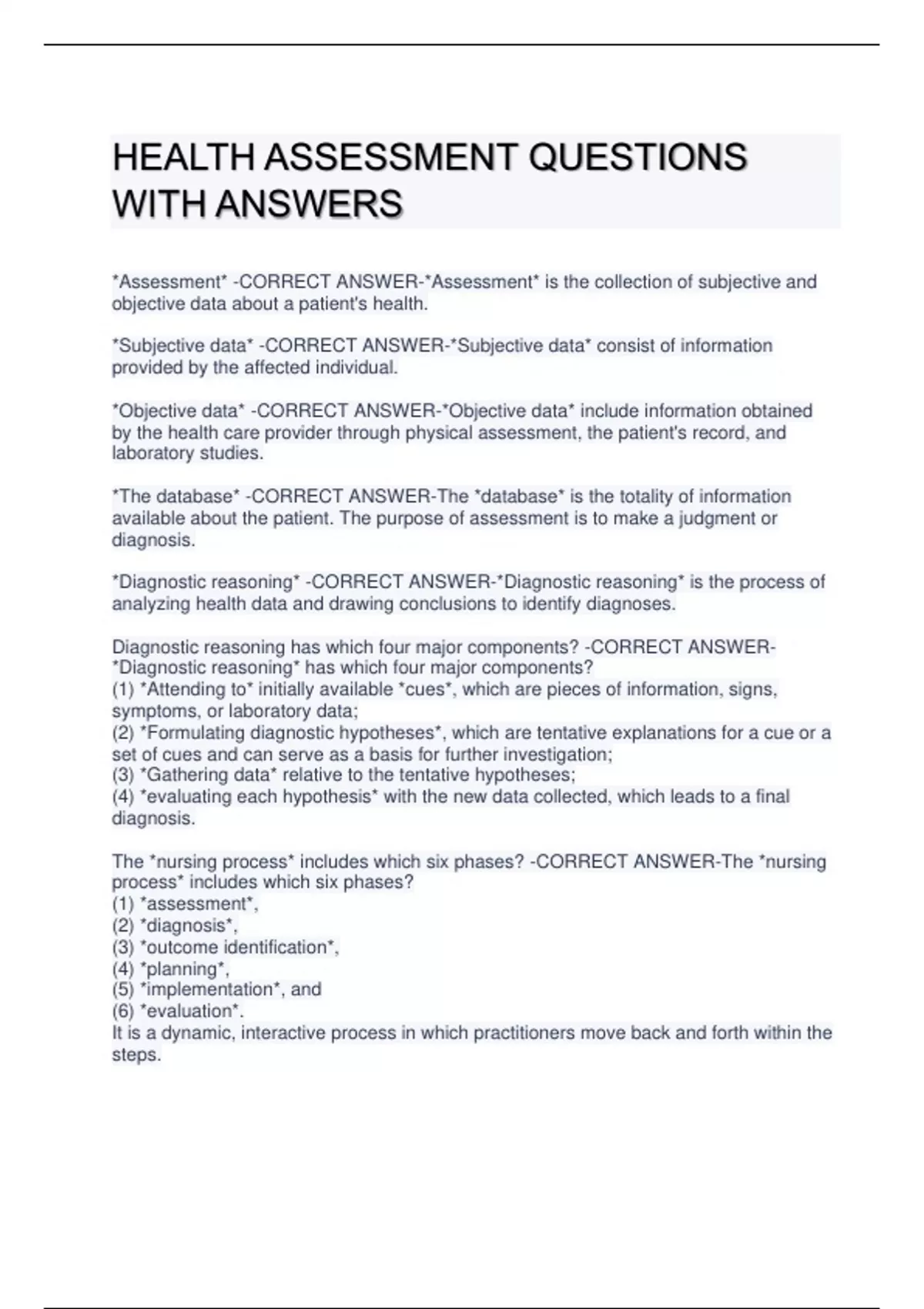 HEALTH ASSESSMENT QUESTIONS WITH ANSWERS *Assessment* -CORRECT ANSWER-*Assessment* is the collection of subjective and objective data about a patient's health. *Subjective data* -CORRECT ANSWER-*Subjective data* consist of information provided by the affected individual. *Objective data* -CORRECT ANSWER-*Objective data* include information obtained by the health care provider through physical assessment, the patient's record, and laboratory studies. *The database* -CORRECT ANSWER-The *database* is the totality of information available about the patient. The purpose of assessment is to make a judgment or diagnosis. *Diagnostic reasoning* -CORRECT ANSWER-*Diagnostic reasoning* is the process of analyzing health data and drawing conclusions to identify diagnoses. Diagnostic reasoning has which four major components? -CORRECT ANSWER- *Diagnostic reasoning* has which four major components? (1) *Attending to* initially available *cues*, which are pieces of information, signs, symptoms, or laboratory data; (2) *Formulating diagnostic hypotheses*, which are tentative explanations for a cue or a set of cues and can serve as a basis for further investigation; (3) *Gathering data* relative to the tentative hypotheses; (4) *evaluating each hypothesis* with the new data collected, which leads to a final diagnosis. The *nursing process* includes which six phases? -CORRECT ANSWER-The *nursing process* includes which six phases? (1) *assessment*, (2) *diagnosis*, (3) *outcome identification*, (4) *planning*, (5) *implementation*, and (6) *evaluation*. It is a dynamic, interactive process in which practitioners move back and forth within the steps. The *novice nurse* -CORRECT ANSWER-The *novice nurse* has no experience with specific patient populations and uses rules to guide performance. The *experienced nurse* -CORRECT ANSWER-The *experienced nurse* understands a patient situation as a whole rather than as a list of tasks, attends to an assessment data pattern, and acts without consciously labeling it. *Critical thinking* -CORRECT ANSWER-*Critical thinking* is the multidimensional thinking process needed for sound diagnostic reasoning and clinical judgment. Seventeen critical thinking skills have been identified, including *setting priorities.* *First-level priority problems* -CORRECT ANSWER-*First-level priority problems* are emergent, life-threatening, and immediate, such as establishing an airway or supporting breathing. *Second-level priority problems* -CORRECT ANSWER-*Second-level priority problems* are next in urgency. They require prompt intervention to prevent deterioration, and may include a mental status change or acute pain. *Third-level priority problems* -CORRECT ANSWER-*Third-level priority problems* are important to the patient's health, but can be addressed after more urgent problems. Examples include lack of knowledge or family coping. Evidence-based practice -CORRECT ANSWER-Evidence-based practice is a systematic approach to practice that uses the *best evidence,* the *clinician's experience,* and the *patient's preferences and values* to make decisions about care and treatment. Every examiner needs to collect *four kinds of databases* based on the situation. What are the four kinds of databases? -CORRECT ANSWER-Every examiner needs to collect *four kinds of databases* based on the situation. What are the four kinds of databases? (1) A *complete (or total health) database* includes a complete health history and a full physical examination. (2) A *focused (or problem-centered) database* is used for a limited or short-term problem. It is smaller in scope and more targeted than the complete database. (3) A *follow-up database* evaluates the status of any identified problem at regular intervals to follow up on short-term or chronic health problems. (4) An *emergency database* calls for rapid collection of data, which commonly occurs while performing lifesaving measures. The *biomedical model* -CORRECT ANSWER-The *biomedical model* of Western medicine views health as the absence of disease. It focuses on collecting data on biophysical signs and symptoms and on curing disease