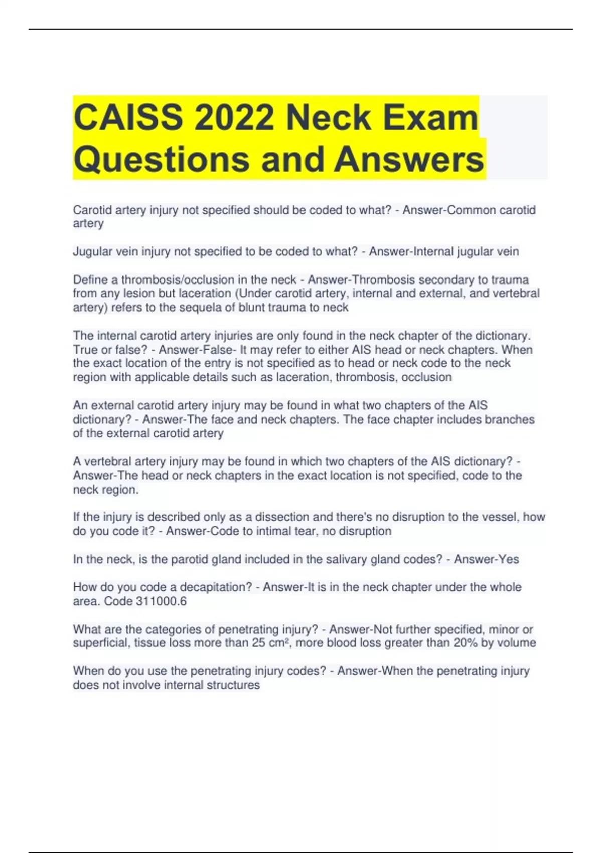 CAISS 2022 Neck Exam Questions and Answers Carotid artery injury not specified should be coded to what? - Answer-Common carotid artery Jugular vein injury not specified to be coded to what? - Answer-Internal jugular vein Define a thrombosis/occlusion in the neck - Answer-Thrombosis secondary to trauma from any lesion but laceration (Under carotid artery, internal and external, and vertebral artery) refers to the sequela of blunt trauma to neck The internal carotid artery injuries are only found in the neck chapter of the dictionary. True or false? - Answer-False- It may refer to either AIS head or neck chapters. When the exact location of the entry is not specified as to head or neck code to the neck region with applicable details such as laceration, thrombosis, occlusion An external carotid artery injury may be found in what two chapters of the AIS dictionary? - Answer-The face and neck chapters. The face chapter includes branches of the external carotid artery A vertebral artery injury may be found in which two chapters of the AIS dictionary? - Answer-The head or neck chapters in the exact location is not specified, code to the neck region.