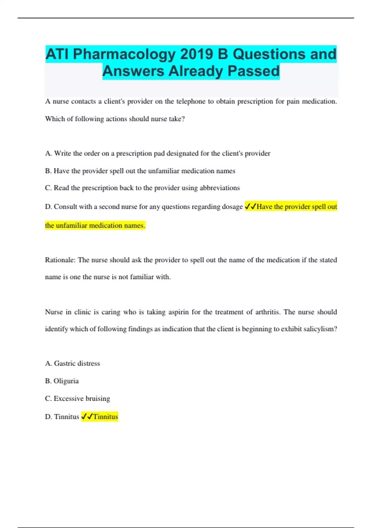 ATI Pharmacology 2019 B Questions and Answers Already Passed