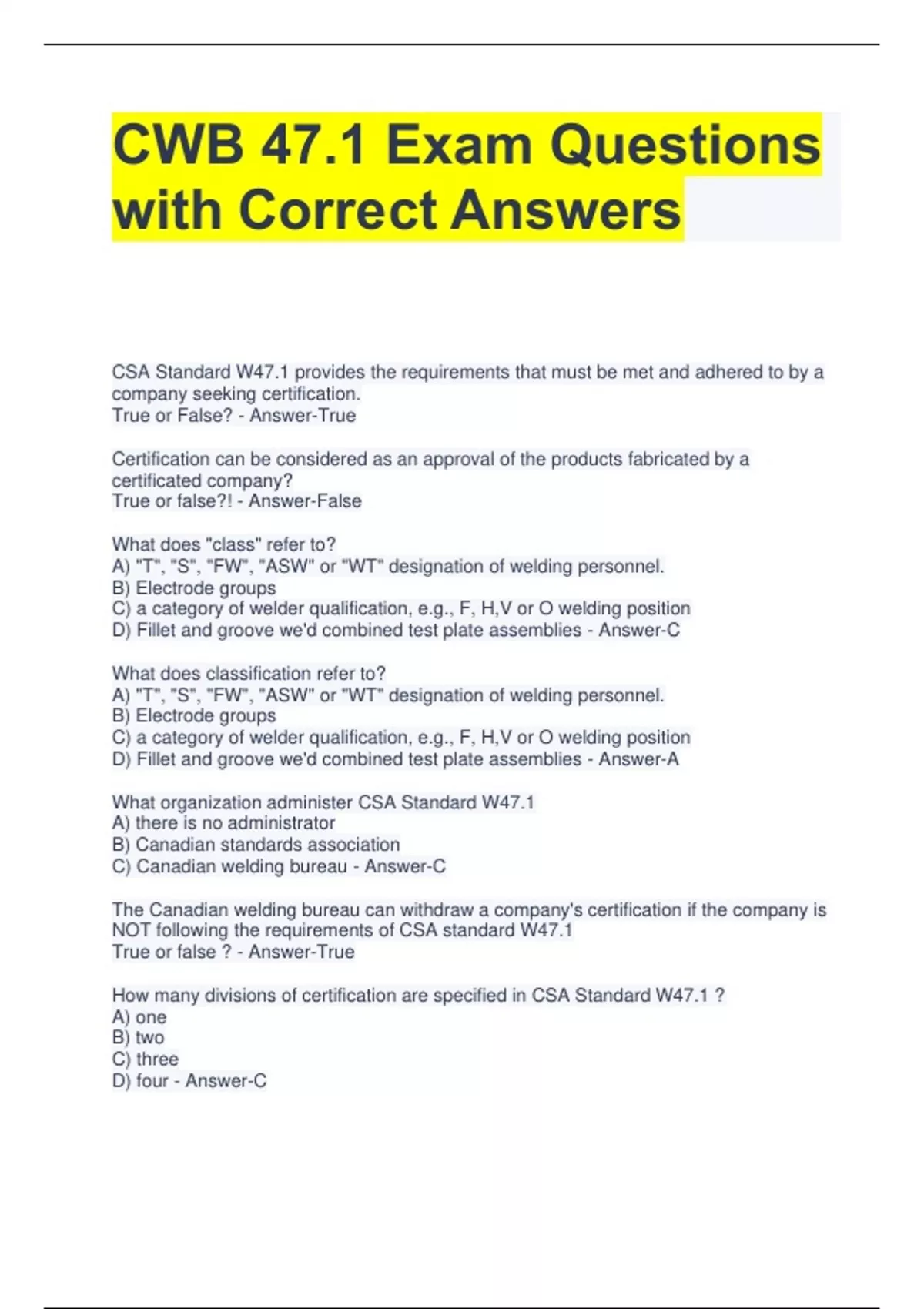 CWB 47.1 Exam Questions with Correct Answers CSA Standard W47.1 provides the requirements that must be met and adhered to by a company seeking certification. True or False? - Answer-True Certification can be considered as an approval of the products fabricated by a certificated company? True or false?! - Answer-False What does "class" refer to? A) "T", "S", "FW", "ASW" or "WT" designation of welding personnel. B) Electrode groups C) a category of welder qualification, e.g., F, H,V or O welding position D) Fillet and groove we'd combined test plate assemblies - Answer-C What does classification refer to? A) "T", "S", "FW", "ASW" or "WT" designation of welding personnel. B) Electrode groups C) a category of welder qualification, e.g., F, H,V or O welding position D) Fillet and groove we'd combined test plate assemblies - Answer-A What organization administer CSA Standard W47.1 A) there is no administrator B) Canadian standards association C) Canadian welding bureau - Answer-C The Canadian welding bureau can withdraw a company's certification if the company is NOT following the requirements of CSA standard W47.1 True or false ? - Answer-True How many divisions of certification are specified in CSA Standard W47.1 ? A) one B) two C) three D) four - Answer-C Is a company certified in division 1 required to employ a full time or retain a part time welding engineer? A) retain a part time welding engineer B) employ a full time welding engineer C) no engineer is required D) employ a full time welding inspector only - Answer-B Is a company certified in division 3 required to employ a full time or retain a part time welding engineer? A) Employ a full time welding engineer B) Retain a part time welding engineer C) retain a part time welding engineer responsible to the company only for welding procedures and practice D) No welding engineer is required - Answer-D