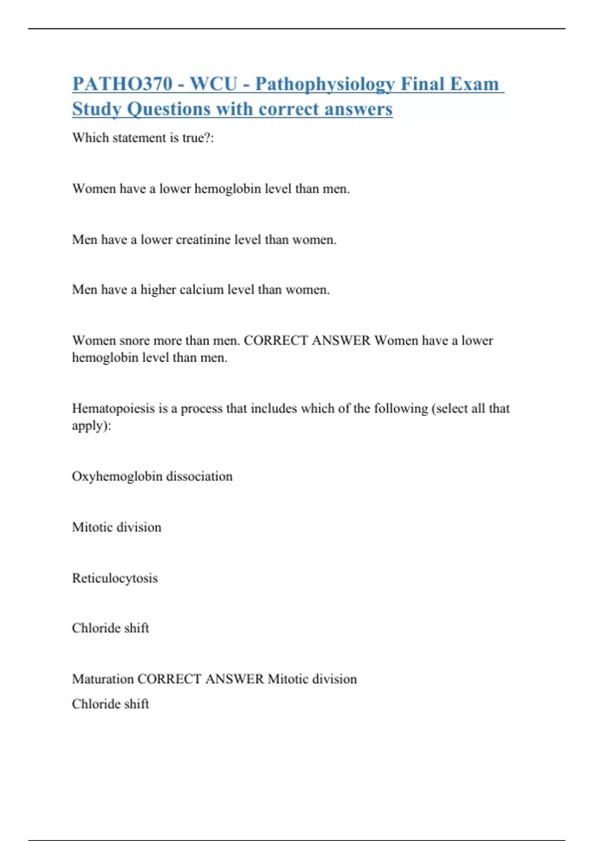 Which statement is true?: Women have a lower hemoglobin level than men. Men have a lower creatinine level than women. Men have a higher calcium level than women. Women snore more than men. CORRECT ANSWER Women have a lower hemoglobin level than men. Hematopoiesis is a process that includes which of the following (select all that apply): Oxyhemoglobin dissociation Mitotic division Reticulocytosis Chloride shift Maturation CORRECT ANSWER M