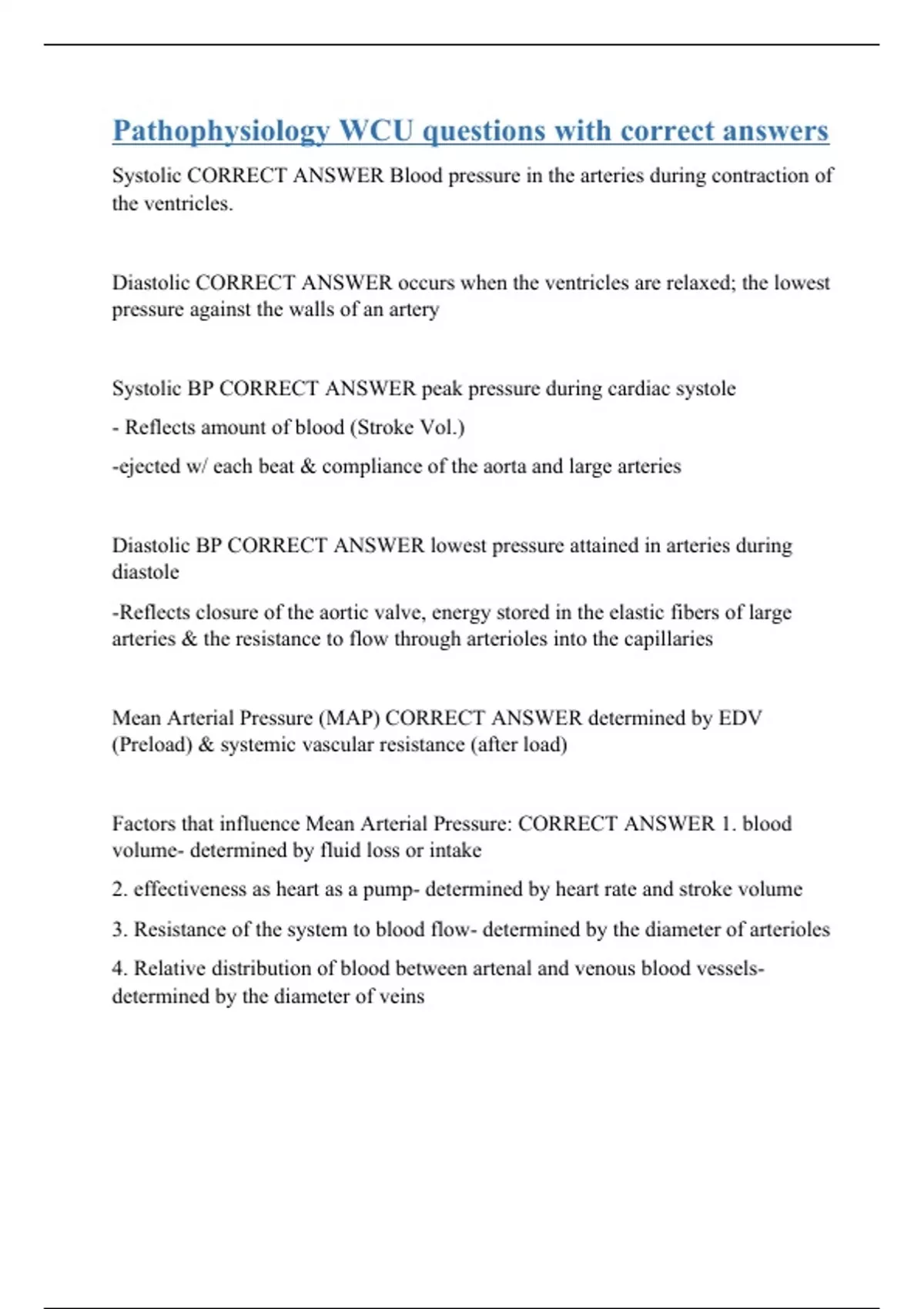 Systolic CORRECT ANSWER Blood pressure in the arteries during contraction of the ventricles. Diastolic CORRECT ANSWER occurs when the ventricles are relaxed; the lowest pressure against the walls of an artery Systolic BP CORRECT ANSWER peak pressure during cardiac systole - Reflects amount of blood (Stroke Vol.) -ejected w/ each beat & compliance of the aorta and large arteries Diastolic BP CORRECT ANSWER lowest pressure attained in arteries during diastole -Reflects closure of the aortic valve, energy stored in the elastic fibers of large arteries & the resistance to flow through arterioles into the capillaries Mean Arterial Pressure (MAP) CORRECT ANSWER determined by EDV (Preload) & systemic vascular resistanc
