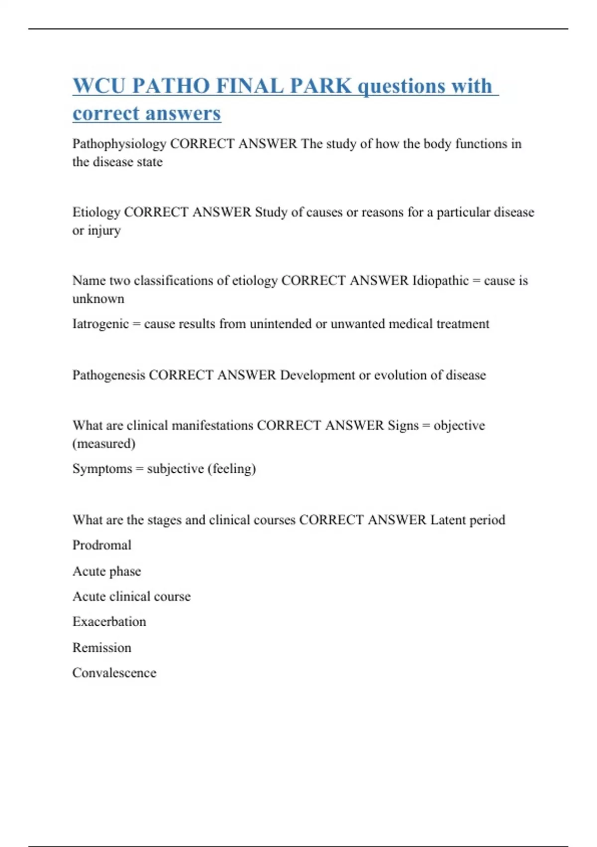 Pathophysiology CORRECT ANSWER The study of how the body functions in the disease state Etiology CORRECT ANSWER Study of causes or reasons for a particular disease or injury Name two classifications of etiology CORRECT ANSWER Idiopathic = cause is unknown Iatrogenic = cause results from unintended or unwanted medical treatment Pathogenesis CORRECT ANSWER Development or evolution of disease What are clinical manifestations CORRECT ANSWER Signs = objective (measured) Symptoms = subjective (feeling) What are the stages and clinical courses CORRECT ANSWER Latent period Prodromal