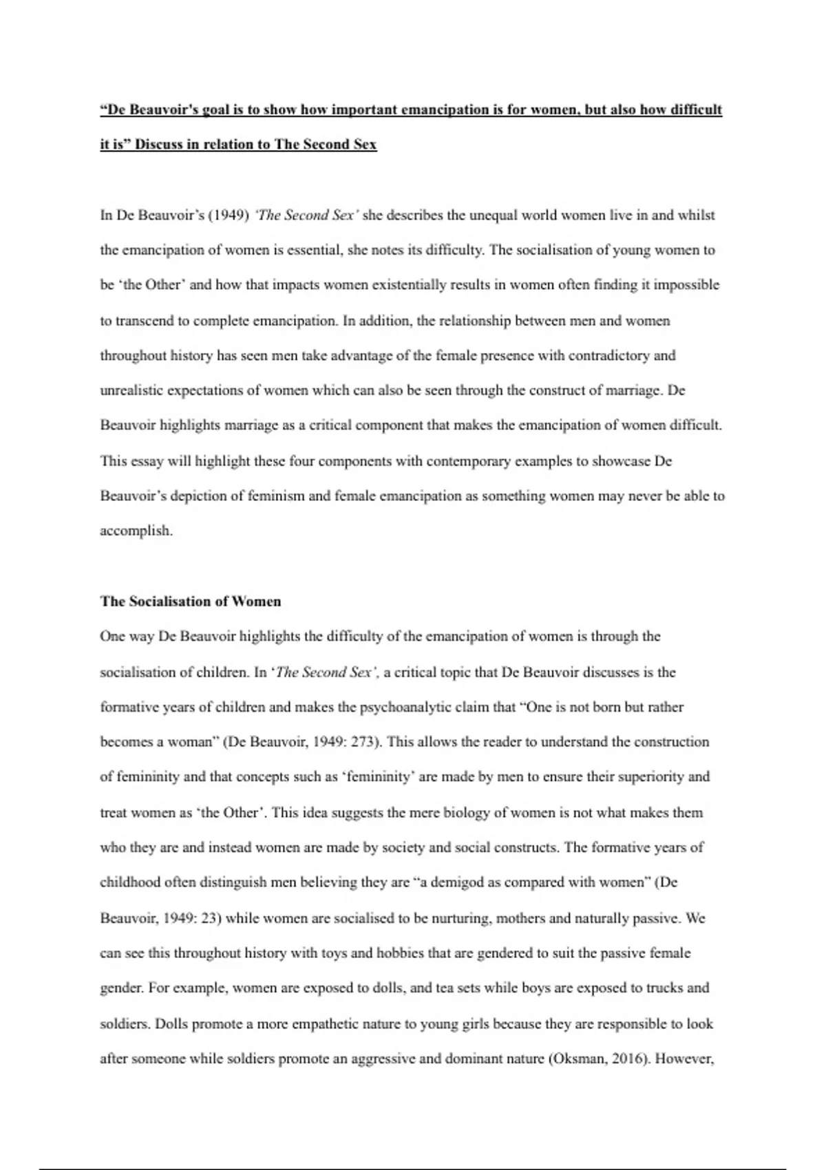 them to be completely emancipated. Therefore, De Beauvoir conveys that socialisation creates