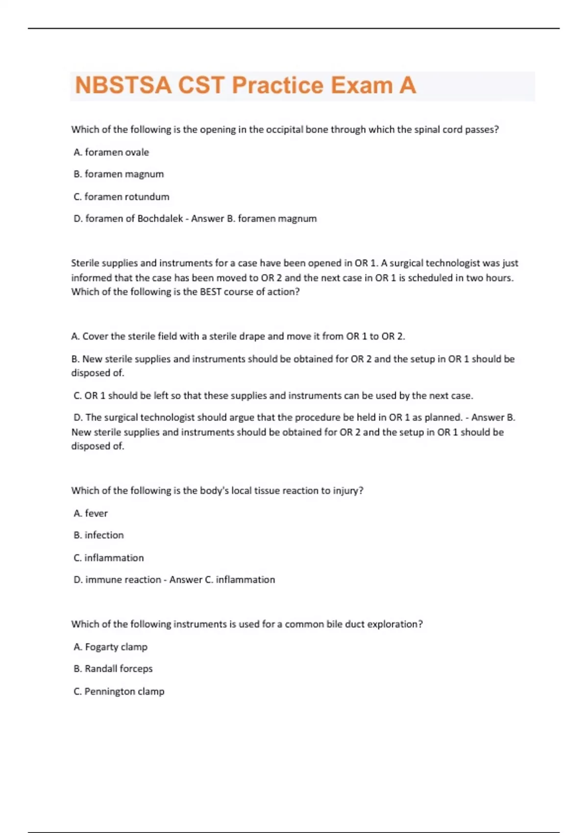 Which of the following is the opening in the occipital bone through which the spinal cord passes? A. foramen ovale B. foramen magnum C. foramen rotundum D. foramen of Bochdalek - Answer B. foramen magnum Sterile supplies and instruments for a case have been opened in OR 1. A surgical technologist was just informed that the case has been moved to OR 2 and the next case in OR 1 is scheduled in two hours. Which of the following is the BEST course of action? A. Cover the sterile field with a sterile drape and move it from OR 1 to OR 2. B. New sterile supplies and instruments should be obtained for OR 2 and the setup in OR 1 should be disposed of. C. OR 1 should be left so that these supplies and instruments can be used by the next case. D. The surgical technologist should argue that the procedure be held in OR 1 as planned. - Answer B. New sterile supplies and instruments should be obtained for OR 2 and the setup in OR 1 should be disposed of. Which of the following is the body's local tissue reaction to injury? A. fever B. infection C. inflammation D. immune reaction - Answer C. inflammation Which of the following instruments is used for a common bile duct exploration? A. Fogarty clamp B. Randall forceps C. Pennington clampD. Forester ring forceps - Answer B. Randall forceps Which of the following is the MOST important consideration when cutting suture? A. avoiding the knot B. using sharp scissors C.opening the scissors wide when cutting D. tagging the end of suture to be cut with a hemostat - Answer A. avoiding the knot Which of the following structures are ligated and divided during the cholecystectomy? A.cystic artery and cystic duct B.hepatic artery and hepatic duct C. cystic artery and common bile duct D. hepatic artery and pancreatic duct - Answer A.cystic artery and cystic duct Which of the following may be used when applying a sterile dressing to a skin graft site? A. pressure dressing B. ABD pad C. 4x4s D. Steri-Strips - Answer A. pressure dressing When performing a dilation and curettage, which of the following instruments is used to grasp the cervix? A. Sims B. Auvard C. Schroeder D. Bozeman - Answer C. SchroederOn the way into the operating room, a terminally ill patient tells the nurse, "No matter what happens, it will be okay." Which of the Five Stages of Grief is the patient MOST likely in? A. denial B. bargaining C. depression D. acceptance - Answer D. acceptance