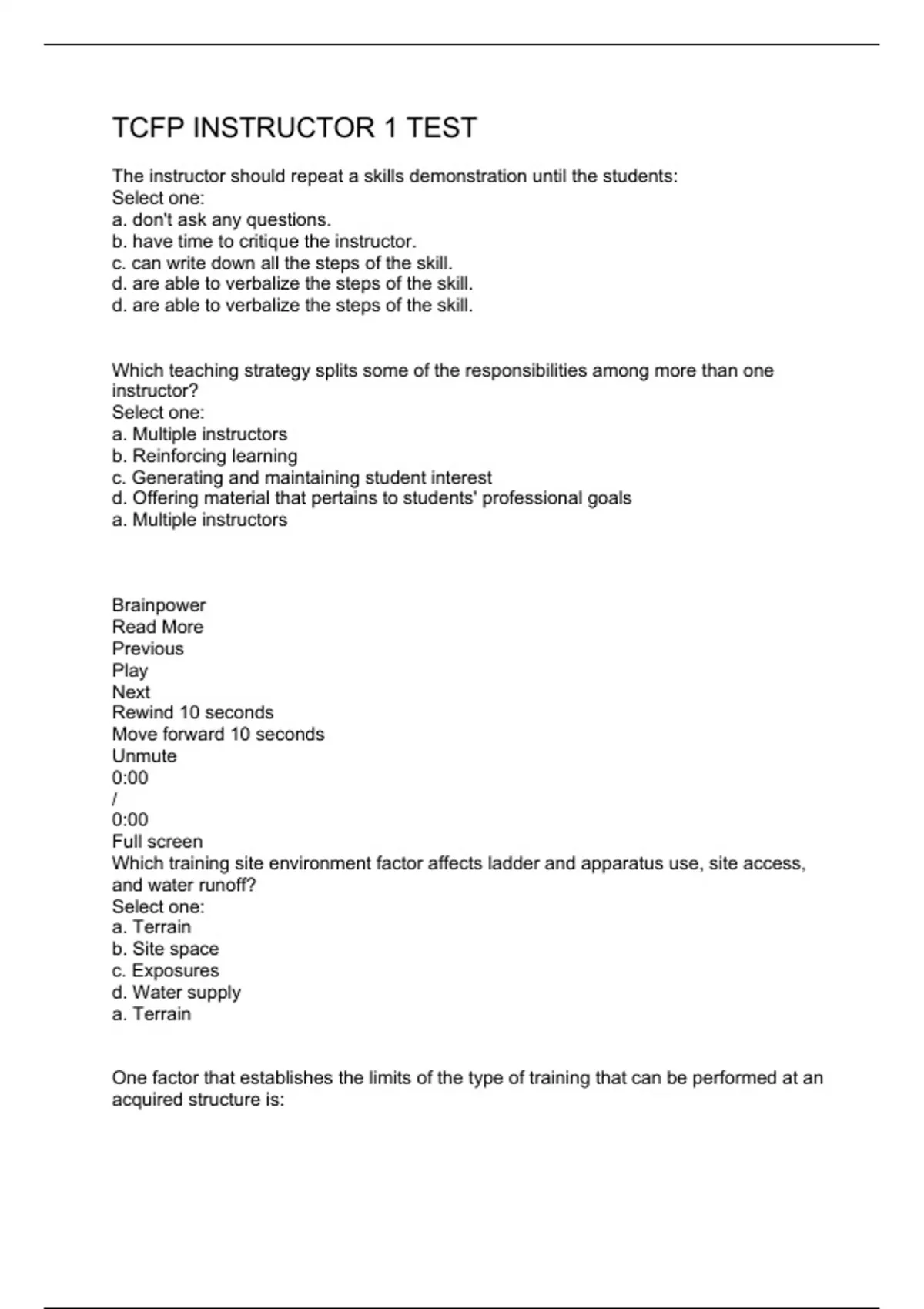 The instructor should repeat a skills demonstration until the students: Select one: a. don't ask any questions. b. have time to critique the instructor. c. can write down all the steps of the skill. d. are able to verbalize the steps of the skill. d. are able to verbalize the steps of the skill. Which teaching strategy splits some of the responsibilities among more than one instructor? Select one: a. Multiple instructors b. Reinforcing learning c. Generating and maintaining student interest d. Offering material that pertains to students' professional goals a. Multiple instructors Brainpower Read More Previous Play Next Rewind 10 seconds Move forward 10 seconds Unmute 0:00 / 0:00 Full screen Which training site environment factor affects ladder and apparatus use, site access, and water runoff? Select one: a. Terrain b. Site space c. Exposures d. Water supply a. Terrain One factor that establishes the limits of the type of training that can be performed at an acquired structure is: S