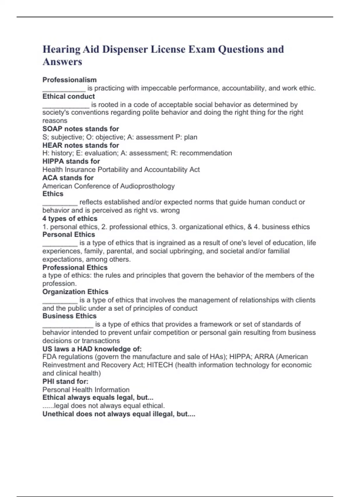 Hearing Aid Dispenser License Exam Questions and Answers Professionalism ___________ is practicing with impeccable performance, accountability, and work ethic. Ethical conduct ____________ is rooted in a code of acceptable social behavior as determined by society's conventions regarding polite behavior and doing the right thing for the right reasons SOAP notes stands for S; subjective; O: objective; A: assessment P: plan HEAR notes stands for H: history; E: evaluation; A: assessment; R: recommendation HIPPA stands for Health Insurance Portability and Accountability Act ACA stands for American Conference of Audioprosthology Ethics _________