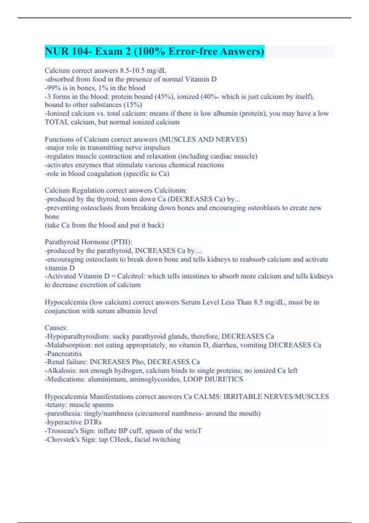 Calcium correct answers 8.5-10.5 mg/dL -absorbed from food in the presence of normal Vitamin D -99% is in bones, 1% in the blood -3 forms in the blood: protein bound (45%), ionized (40%- which is just calcium by itself), bound to other substances (15%) -Ionized calcium vs. total calcium: means if there is low albumin (protein), you may have a low TOTAL calcium, but normal ionized calcium Functions of Calcium correct answers (MUSCLES AND NERVES) -major role in transmitting nerve impulses -regulates muscle contraction and relaxation (including cardiac muscle) -activates enzymes that stimulate various chemical reactions -role in blood coagulation (specific to Ca) Calcium Regulation correct answers Calcitonin: -produced by the thyroid, tonin down Ca (DECREASES Ca) by... -preventing osteoclasts from breaking down bones and encouraging osteoblasts to create new bone (take Ca from the blood and put it back) Parathyroid Hormone (PTH): -produced by the parathyroid, INCREASES Ca by.... -encouraging osteoclasts to break down bone and tells kidneys to reabsorb calcium and activate vitamin D -Activated Vitamin D = Calcitrol: which tells intestines to absorb more calcium and tells kidneys to decrease excretion of calcium Hypocalcemia (low calcium) correct answers Serum Level Less Than 8.5 mg/dL, must be in conjunction with serum albumin level Causes: -Hypoparathyroidism: sucky parathyroid glands, therefore, DECREASES Ca -Malabsorption: not eating appropriately, no vitamin D, diarrhea, vomiting DECREASES Ca -Pancreatitis -Renal failure: INCREASES Pho, DECREASES Ca -Alkalosis: not enough hydrogen, calcium binds to single proteins; no ionized Ca left -Medications: aluminimum, aminoglycosides, LOOP DIURETICS Hypocalcemia Manifestations correct answers Ca CALMS: IRRITABLE NERVES/MUSCLES -tetany: muscle spasms -paresthesia: tingly/numbness (circumoral numbness- around the mouth) -hyperactive DTRs -Trosseau's Sign: inflate BP cuff, spasm of the wrisT -Chovstek's Sign: tap CHeek, facial twitching