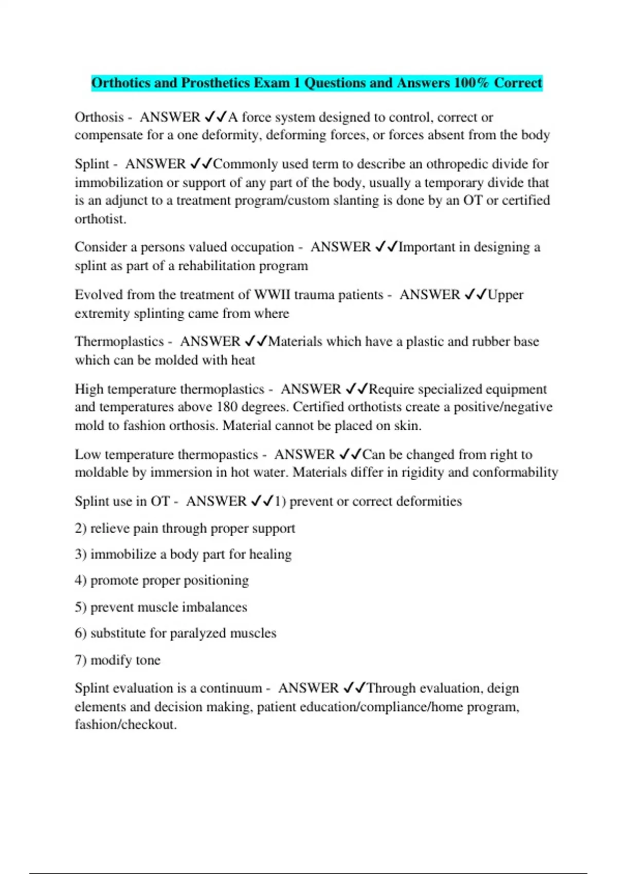Orthotics and Prosthetics Exam 1 Questions and Answers 100% Correct Orthosis - ANSWER ️️ A force system designed to control, correct or compensate for a one deformity, deforming forces, or forces absent from the body Splint - ANSWER ️️ Commonly used term to describe an othropedic divide for immobilization or support of any part of the body, usually a temporary divide that is an adjunct to a treatment program/custom slanting is done by an OT or certified orthotist. Consider a persons valued occupation - ANSWER ️️ Important in designing a splint as part of a rehabilitation program Evolved from the treatment of WWII trauma patients - ANSWER ️️ Upper extremity splinting came from where Thermoplastics - ANSWER ️️ Materials which have a plastic and rubber base which can be molded with heat High temperature thermoplastics - ANSWER ️️ Require specialized equipment and temperatures above 180 degrees. Certified orthotists create a positive/negative mold to fashion orthosis. Material cannot be placed on skin. Low temperature thermopastics - ANSWER ️️ Can be changed from right to moldable by immersion in hot water. Materials differ in rigidity and conformability Splint use in OT - ANSWER ️️ 1) prevent or correct deformities 2) relieve pain through proper support 3) immobilize a body part for healing 4) promote proper positioning 5) prevent muscle imbalances 6) substitute for paralyzed muscles 7) modify tone Splint evaluation is a continuum - ANSWER ️️ Through evaluation, deign elements and decision making, patient education/compliance/home program, fashion/checkout
