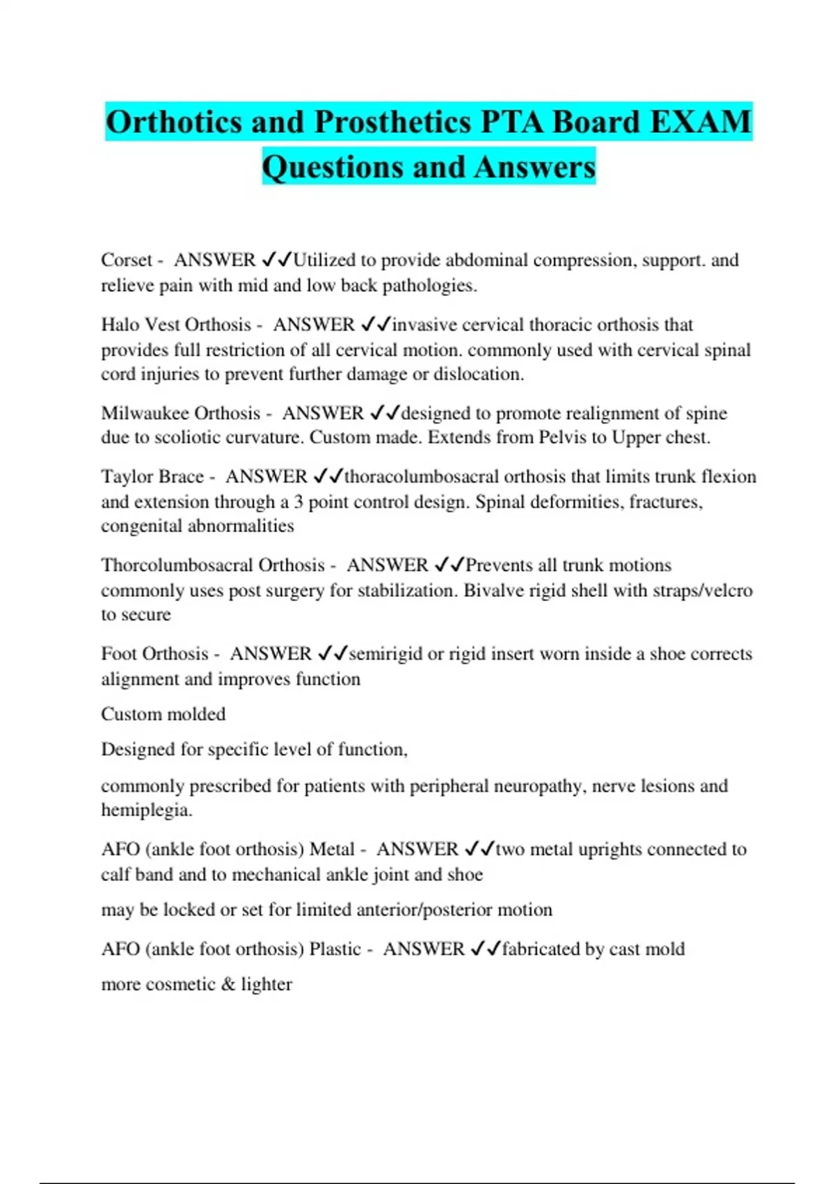 Orthotics and Prosthetics PTA Board EXAM Questions and Answers Corset - ANSWER ️️ Utilized to provide abdominal compression, support. and relieve pain with mid and low back pathologies. Halo Vest Orthosis - ANSWER ️️ invasive cervical thoracic orthosis that provides full restriction of all cervical motion. commonly used with cervical spinal cord injuries to prevent further damage or dislocation. Milwaukee Orthosis - ANSWER ️️ designed to promote realignment of spine due to scoliotic curvature. Custom made. Extends from Pelvis to Upper chest. Taylor Brace - ANSWER ️️ thoracolumbosacral orthosis that limits trunk flexion and extension through a 3 point control design. Spinal deformities, fractures, congenital abnormalities Thorcolumbosacral Orthosis - ANSWER ️️ Prevents all trunk motions commonly uses post surgery for stabilization. Bivalve rigid shell with straps/velcro to secure Foot Orthosis - ANSWER ️️ semirigid or rigid insert worn inside a shoe corrects alignment and improves function Custom molded Designed for specific level of function, commonly prescribed for patients with peripheral neuropathy, nerve lesions and hemiplegia. AFO (ankle foot orthosis) Metal - ANSWER ️️ two metal uprights connected to calf band and to mechanical ankle joint and shoe may be locked or set for limited anterior/posterior motion AFO (ankle foot orthosis) Plastic - ANSWER ️️ fabricated by cast mold more cosmetic & lighter