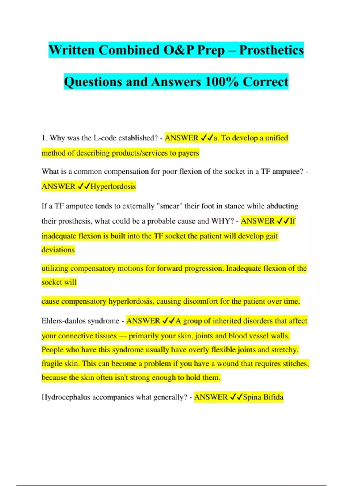 Written Combined O&P Prep – Prosthetics Questions and Answers 100% Correct 1. Why was the L-code established? - ANSWER ️️ a. To develop a unified method of describing products/services to payers What is a common compensation for poor flexion of the socket in a TF amputee? - ANSWER ️️ Hyperlordosis If a TF amputee tends to externally "smear" their foot in stance while abducting their prosthesis, what could be a probable cause and WHY? - ANSWER ️️ If inadequate flexion is built into the TF socket the patient will develop gait deviations utilizing compensatory motions for forward progression. Inadequate flexion of the socket will cause compensatory hyperlordosis, causing discomfort for the patient over time. Ehlers-danlos syndrome - ANSWER ️️ A group of inherited disorders that affect your connective tissues — primarily your skin, joints and blood vessel walls. People who have this syndrome usually have overly flexible joints and stretchy, fragile skin. This can become a problem if you have a wound that requires stitches, because the skin often isn't strong enough to hold them. Hydrocephalus accompanies what generally? - ANSWER ️️ Spina Bifida