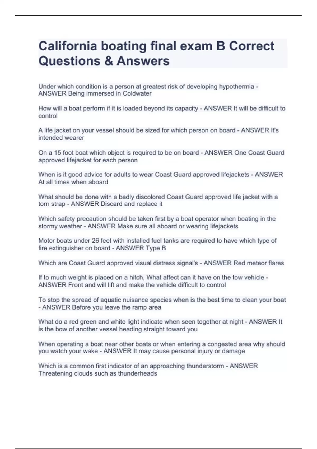 Under which condition is a person at greatest risk of developing hypothermia - ANSWER Being immersed in Coldwater How will a boat perform if it is loaded beyond its capacity - ANSWER It will be difficult to control A life jacket on your vessel should be sized for which person on board - ANSWER It's intended wearer On a 15 foot boat which object is required to be on board - ANSWER One Coast Guard approved lifejacket for each person When is it good advice for adults to wear Coast Guard approved lifejackets - ANSWER At all times when aboard What should be done with a badly discolored Coast Guard approved life jacket with a torn strap - ANSWER Discard and replace it Which safety precaution should be taken first by a boat operator when boating in the stormy weather - ANSWER Make sure all aboard or wearing lifejackets Motor boats under 26 feet with installed fuel tanks are required to have which type of fire extinguisher on board - ANSWER Type B Which are Coast Guard approved visual distress signal's - ANSWER Red meteor flares If to much weight is placed on a hitch, What affect can it have on the tow vehicle - ANSWER Front and will lift and make the vehicle difficult to control To stop the spread of aquatic nuisance species when is the best time to clean your boat - ANSWER Before you leave the ramp area