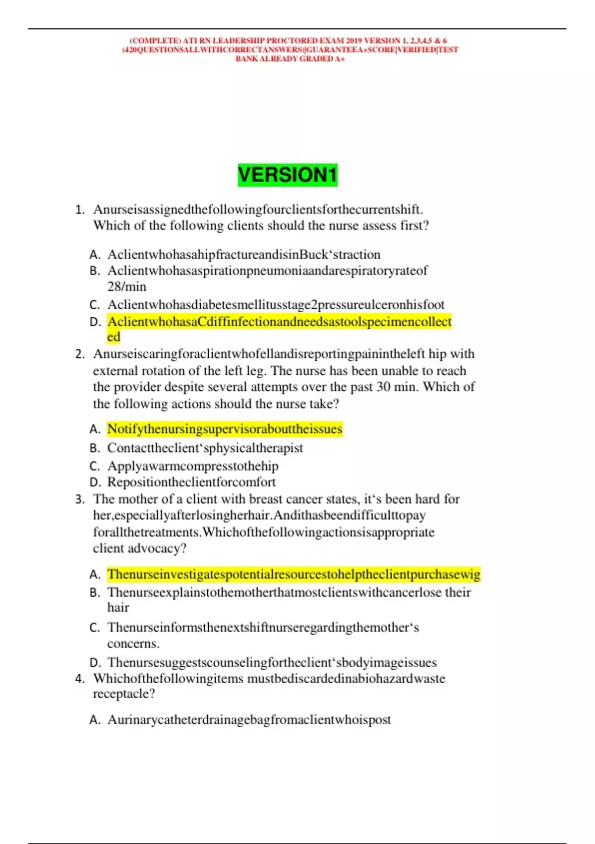 (COMPLETE) ATI RN LEADERSHIP PROCTORED EXAM 2019 VERSION 1, 2,3,4,5 & 6 (420QUESTIONSALLWITHCORRECTANSWERS) GUARANTEEA+SCORE ERIFIED TESTBANK ALREADY GRADED A+