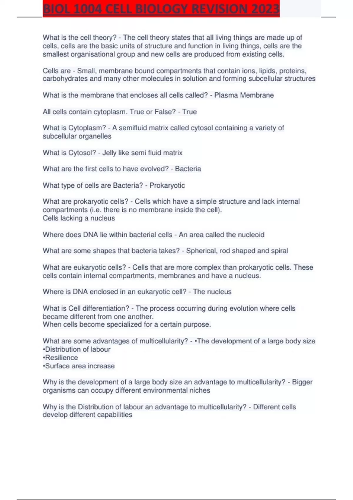 BIOL 1004 CELL BIOLOGY REVISION 2023.