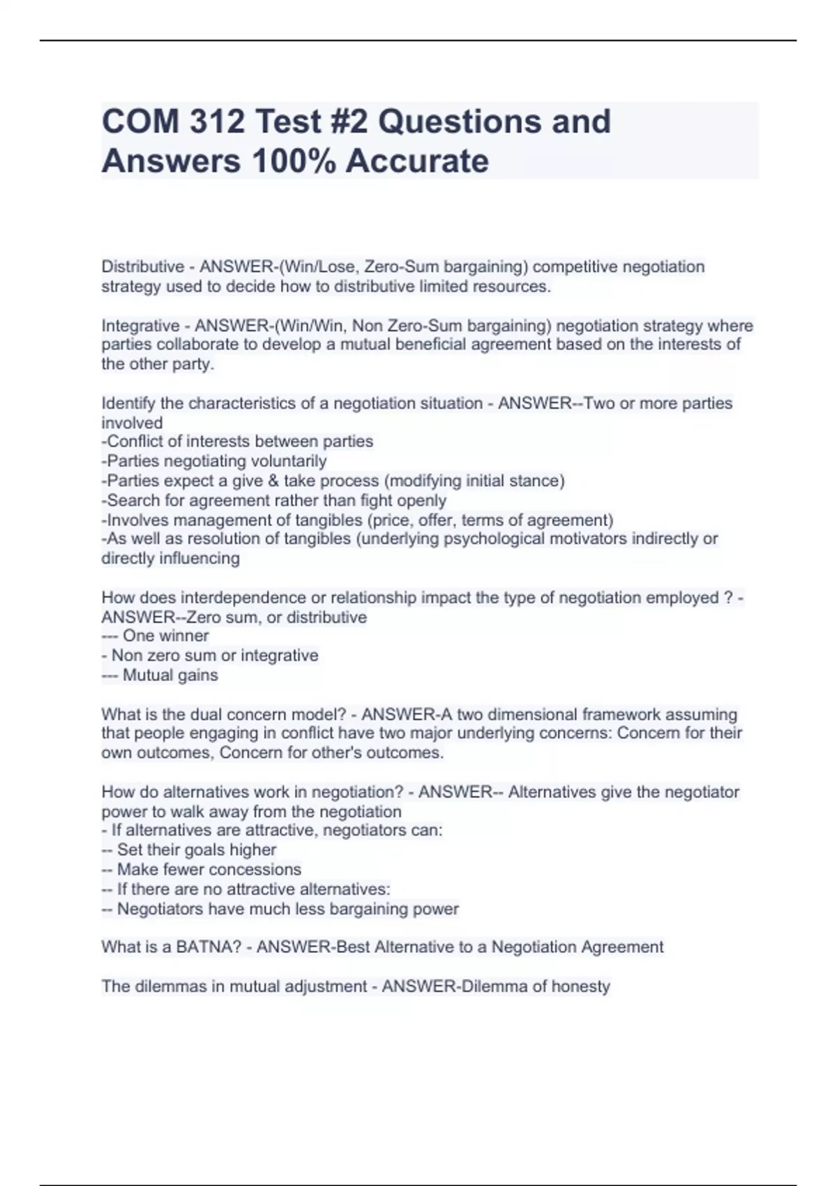 COM 312 Test #2 Questions and Answers 100% Accurate COM 312 Test #2 Questions and Answers 100% Accurate COM 312 Test #2 Questions and Answers 100% Accurate Distributive - ANSWER-(Win/Lose, Zero-Sum bargaining) competitive negotiation strategy used to decide how to distributive limited resources. Integrative - ANSWER-(Win/Win, Non Zero-Sum bargaining) negotiation strategy where parties collaborate to develop a mutual beneficial agreement based on the interests of the other party. Identify the characteristics of a negotiation situation - ANSWER--Two or more parties involved