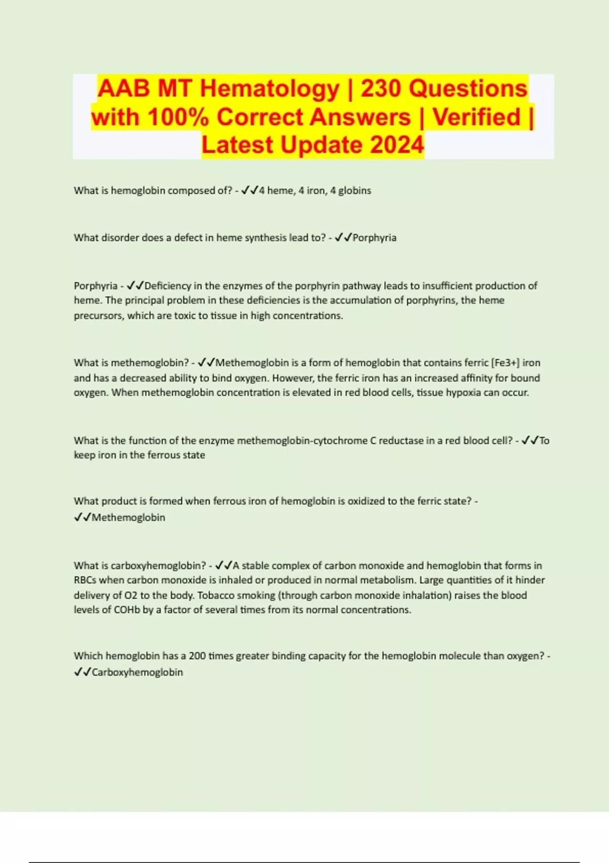 AAB MT Hematology | 230 Questions with 100% Correct Answers | Verified | Latest Update 2024 | 22 Pages