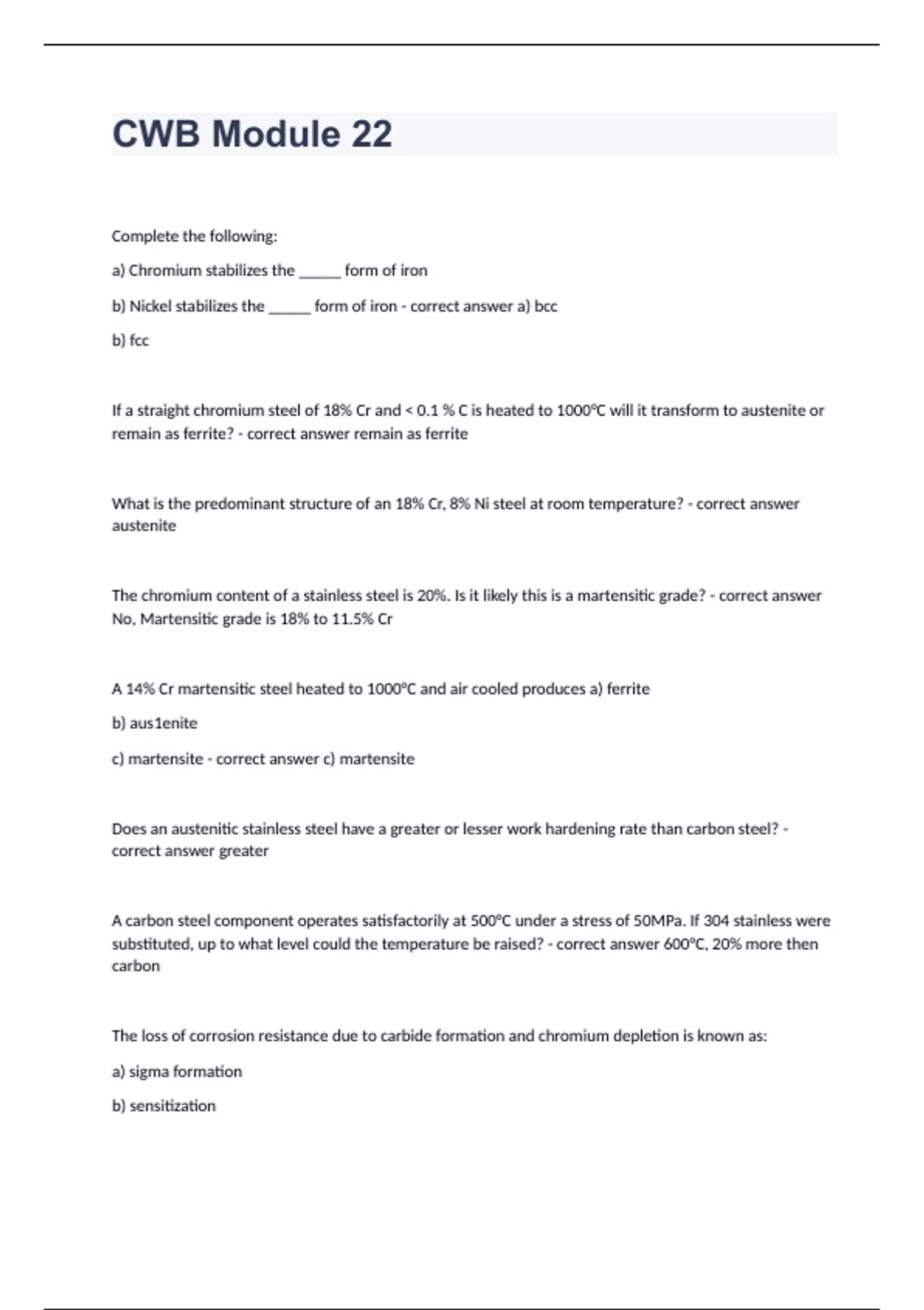 CWB Module 22Complete the following: a) Chromium stabilizes the _____ form of iron b) Nickel stabilizes the _____ form of iron - correct answer a) bcc b) fcc If a straight chromium steel of 18% Cr and < 0.1 % C is heated to 1000°C will it transform to austenite or remain as ferrite? - correct answer remain as ferrite What is the predominant structure of an 18% Cr, 8% Ni steel at room temperature? - correct answer austenite The chromium content of a stainless steel is 20%. Is it likely this is a martensitic grade? - correct answer No, Martensitic grade is 18% to 11.5% Cr A 14% Cr martensitic steel heated to 1000°C and air cooled produces a) ferrite b) aus1enite c) martensite - correct answer c) martensite Does an austenitic stainless steel have a greater or lesser work hardening rate than carbon steel? - correct answer greater A carbon steel component operates satisfactorily at 500°C under a stress of 50MPa. If 304 stainless were substituted, up to what level could the temperature be raised? - correct answer 600°C, 20% more then carbon The loss of corrosion resistance due to carbide formation and chromium depletion is known as: a) sigma formation b) sensitization c) stabilization - correct answer b) sensitization What maximum carbon level is usually specified to ensure freedom from sensitization during welding? a) 0.03% b) 0.003% C) 0.3% - correct answer a) 0.03% The presence of residual delta ferrite in the weld metal indicates that primary solidification was? a) ferrite b) austenite - correct answer a) ferrite A method of controlling weld metal fissuring is to always use a stabilized weld metal to ensure primary solidification is austenite: a) is to always use a stabilized weld metal b) to ensure primary solidification is austenite c) to ensure there is a small amount of residual delta ferrite in the weld metal - correct answer c) to ensure there is a small amount of residual delta ferrite in the weld metal True or false: "Welds in austenitic stainless steels are always preheated to prevent hydrogen induced cracking - correct answer False When a two layer overlay of stainless on carbon steel is made it is common practice to use E308 for the second layer and E _____for the first layer - correct answer (E309) on top of the carbon and then E308 Weld metal containing large amounts of ferrite and is exposed to high temperature service may: a) suffer embrittlement due to sigma formation b) have improved ductility due to ferri1e growth c) become air hardening - correct answer a) suffer embrittlement due to sigma formation Preheat is usually required when welding martensitic stainless steels: a) to prevent cracking b) to soften the HAZ c) to promote ferrite - correct answer a) to prevent cracking Why would 650°C be a better temperature to specify for a PWHT of a welded martensitic stainless steel than 550°C - correct answer To avoid temper embrittlement True or false: "Ferritic stainless steels are very tolerant of contamination during welding because of their very high ductility" - correct answer False True or false? "Conventional flame cutting with oxy-acetylene cannot be used on stainless steels" - correct answer True Which of the following actions might reduce the risk of carbon contamination in welding stainless steels? a} use aluminum oxide grinding wheels reserved for stainless steel b) use cellulosic type electrodes c} carefully clean off grease and dirt before welding d) use stainless steel cleaning brushes e} use C02 for back shielding the weld - correct answer a} use aluminum oxide grinding wheels reserved for stainless steel c} carefully clean off grease and dirt before welding d) use stainless steel cleaning brushes If a buttering technique is used to weld 304 stainless to mild steel what should be used for the butter layer? a) E48018 (mild steel) b) E308