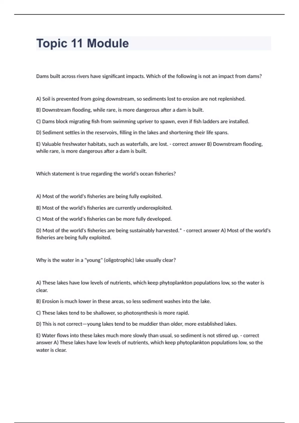 Topic 11 Module Question and answers 100% correct 2023/2024Dams built across rivers have significant impacts. Which of the following is not an impact from dams? A) Soil is prevented from going downstream, so sediments lost to erosion are not replenished. B) Downstream flooding, while rare, is more dangerous after a dam is built. C) Dams block migrating fish from swimming upriver to spawn, even if fish ladders are installed. D) Sediment settles in the reservoirs, filling in the lakes and shortening their life spans. E) Valuable freshwater habitats, such as waterfalls, are lost. - correct answer B) Downstream flooding, while rare, is more dangerous after a dam is built. Which statement is true regarding the world's ocean fisheries? A) Most of the world's fisheries are being fully exploited. B) Most of the world's fi