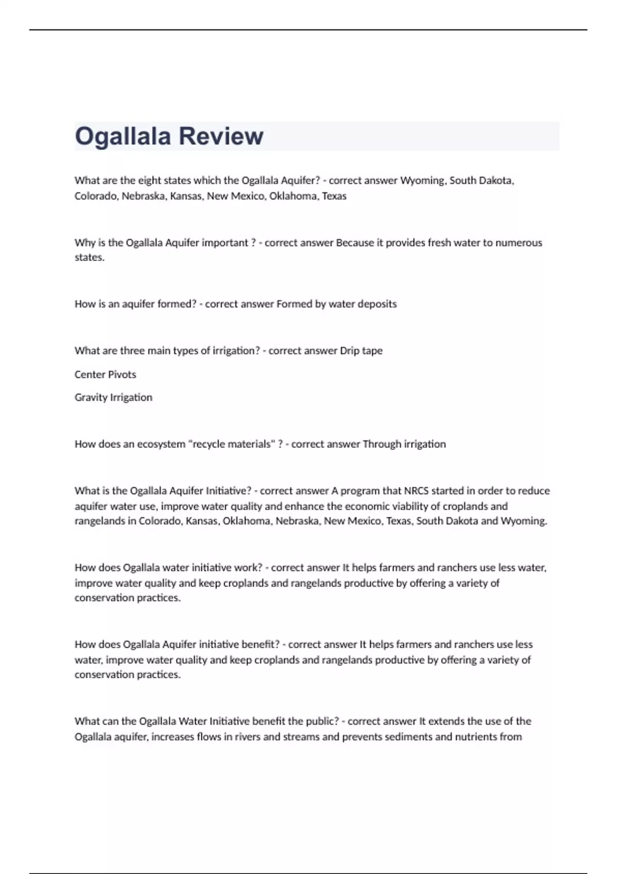 Ogallala Review Questions with complete solution 2023/2024What are the eight states which the Ogallala Aquifer? - correct answer Wyoming, South Dakota, Colorado, Nebraska, Kansas, New Mexico, Oklahoma, Texas Why is the Ogallala Aquifer important ? - correct answer Because it provides fresh water to numerous states. How is an aquifer formed? - correct answer Formed by water deposits What are three main types of irrigation? - correct answer Drip tape Center Pivots Gravity Irrigation How does an ecosystem